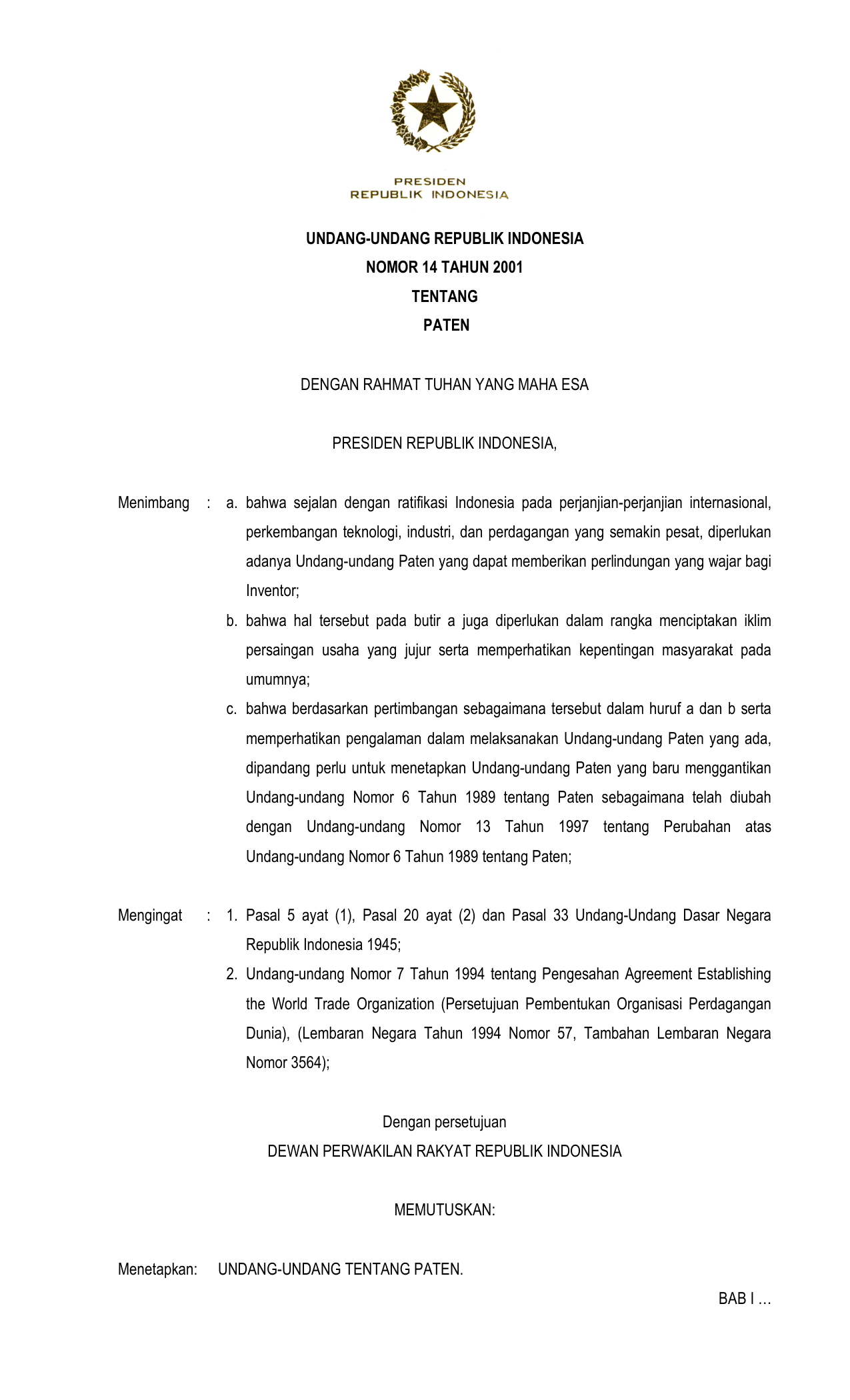 UU Nomor 14 Tahun 2001 | Undang-Undang Nomor 14 Tahun 2001 tentang PATEN