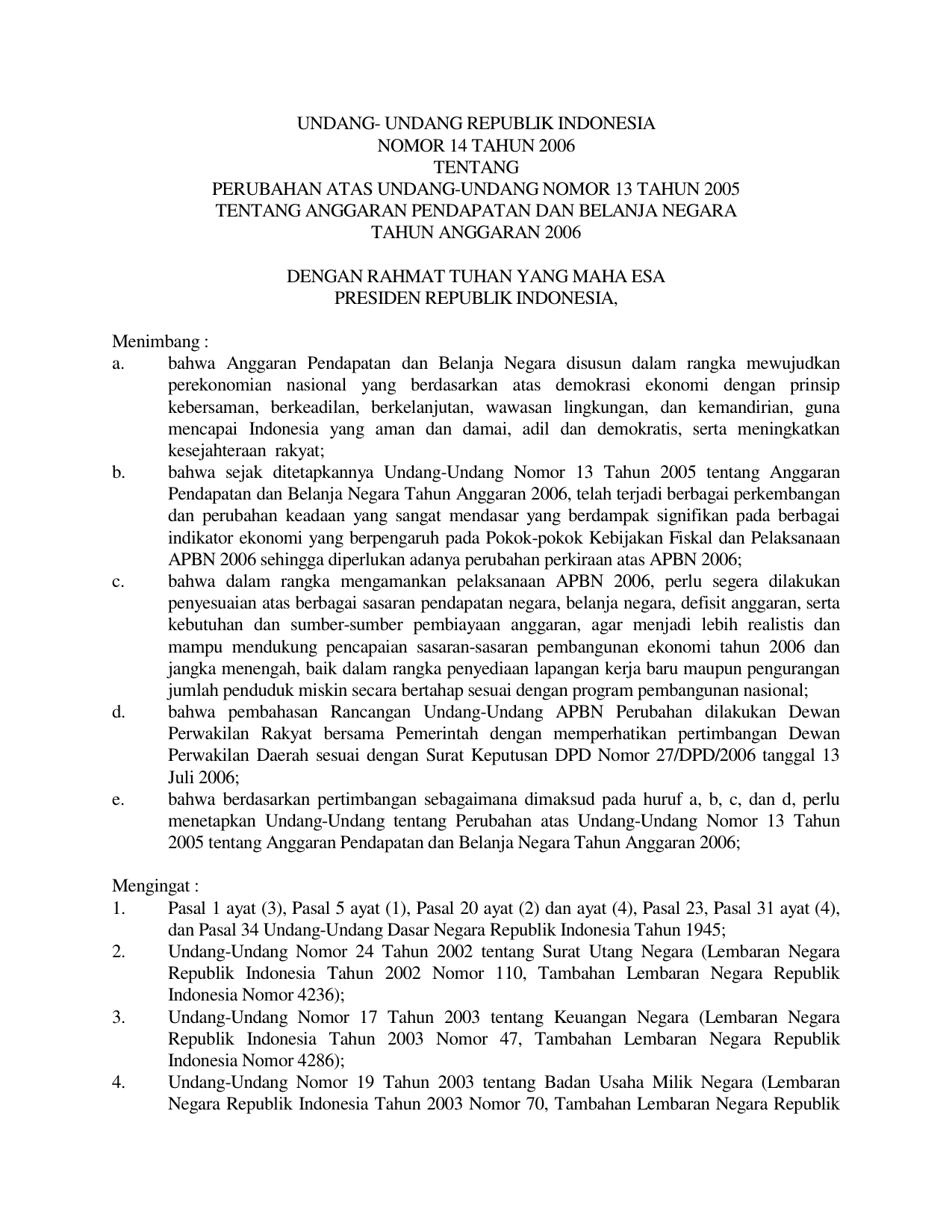 UU Nomor 14 Tahun 2006 | Undang-Undang Nomor 14 Tahun 2006 tentang PERUBAHAN UU 13-2005 TENTANG ANGGARAN PENDAPATAN DAN BELANJA NEGARA TAHUN ANGGARAN 2006