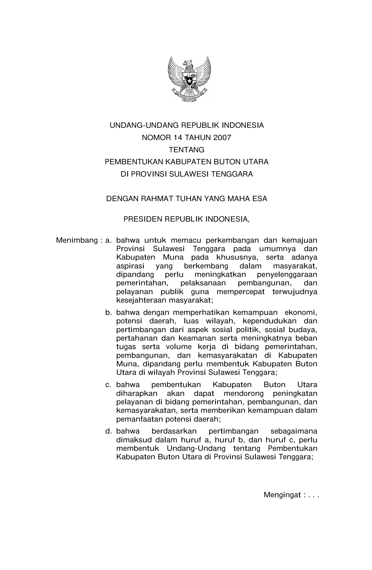 UU Nomor 14 Tahun 2007 | Undang-Undang Nomor 14 Tahun 2007 tentang PEMBENTUKAN KABUPATEN BUTON UTARA DI PROVINSI SULAWESI TENGGARA
