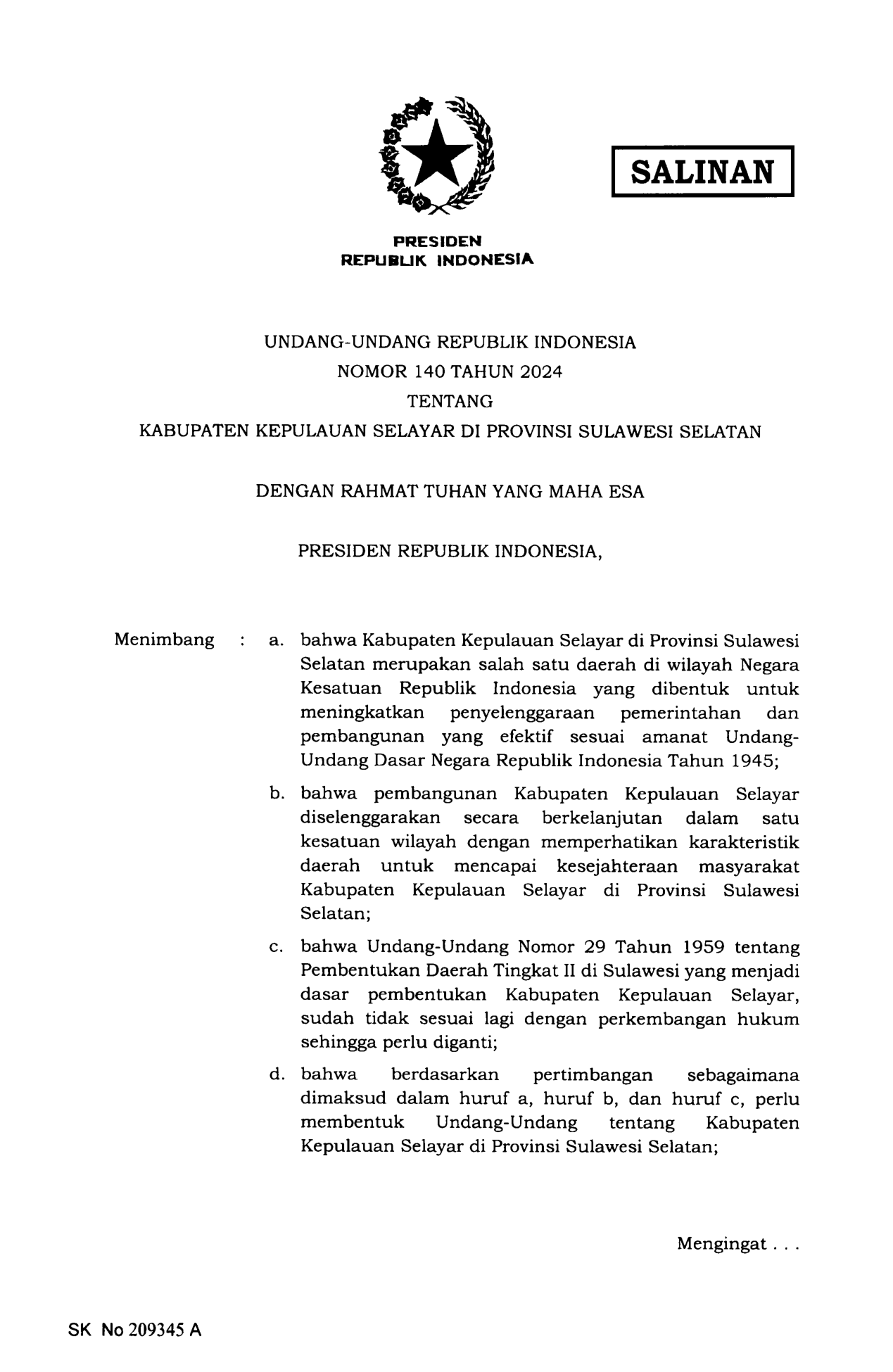 UU Nomor 140 Tahun 2024 | Undang-Undang Nomor 140 Tahun 2024 tentang KABUPATEN KEPULAUAN SELAYAR DI PROVINSI SULAWESI SELATAN