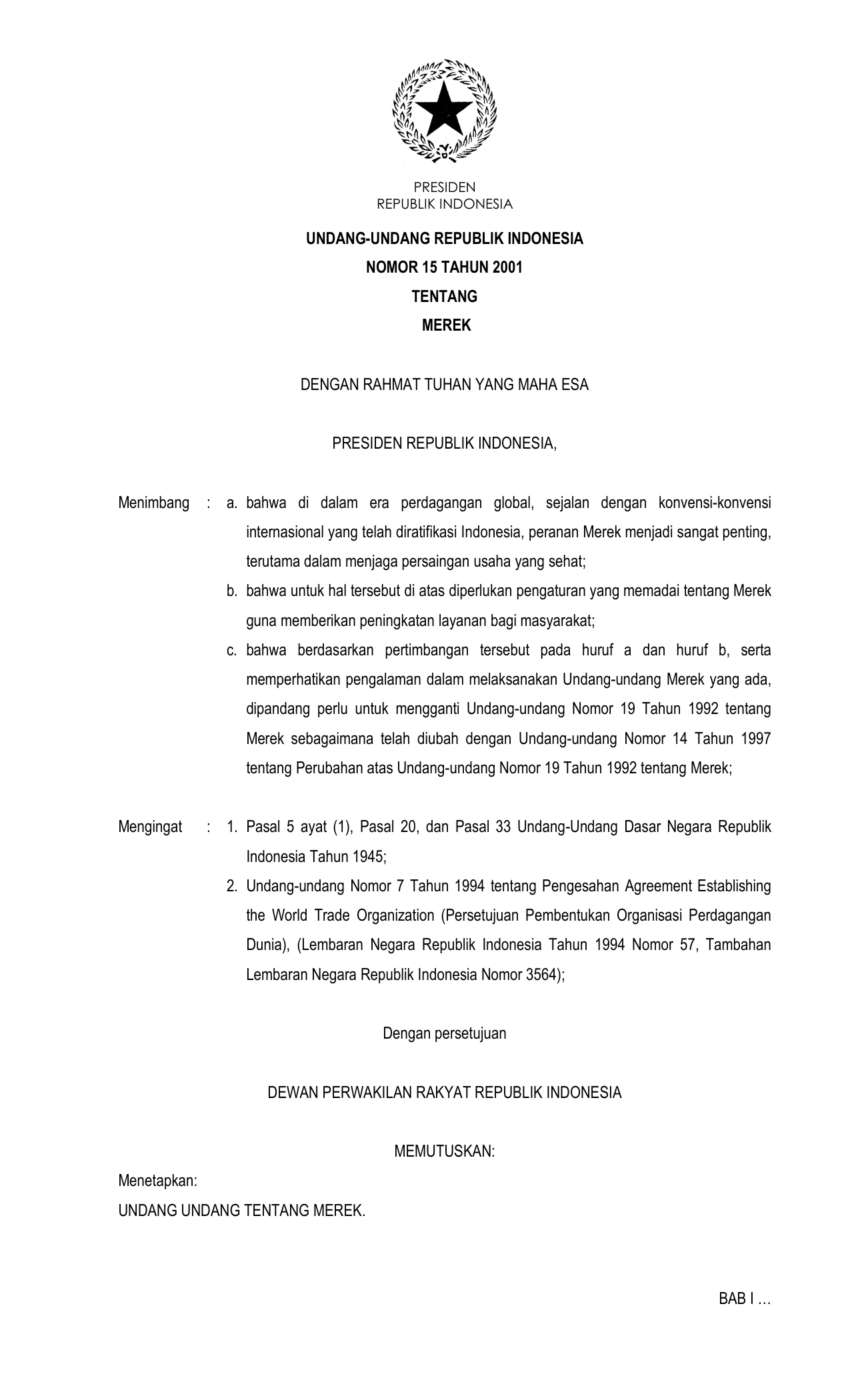 UU Nomor 15 Tahun 2001 | Undang-Undang Nomor 15 Tahun 2001 tentang MEREK