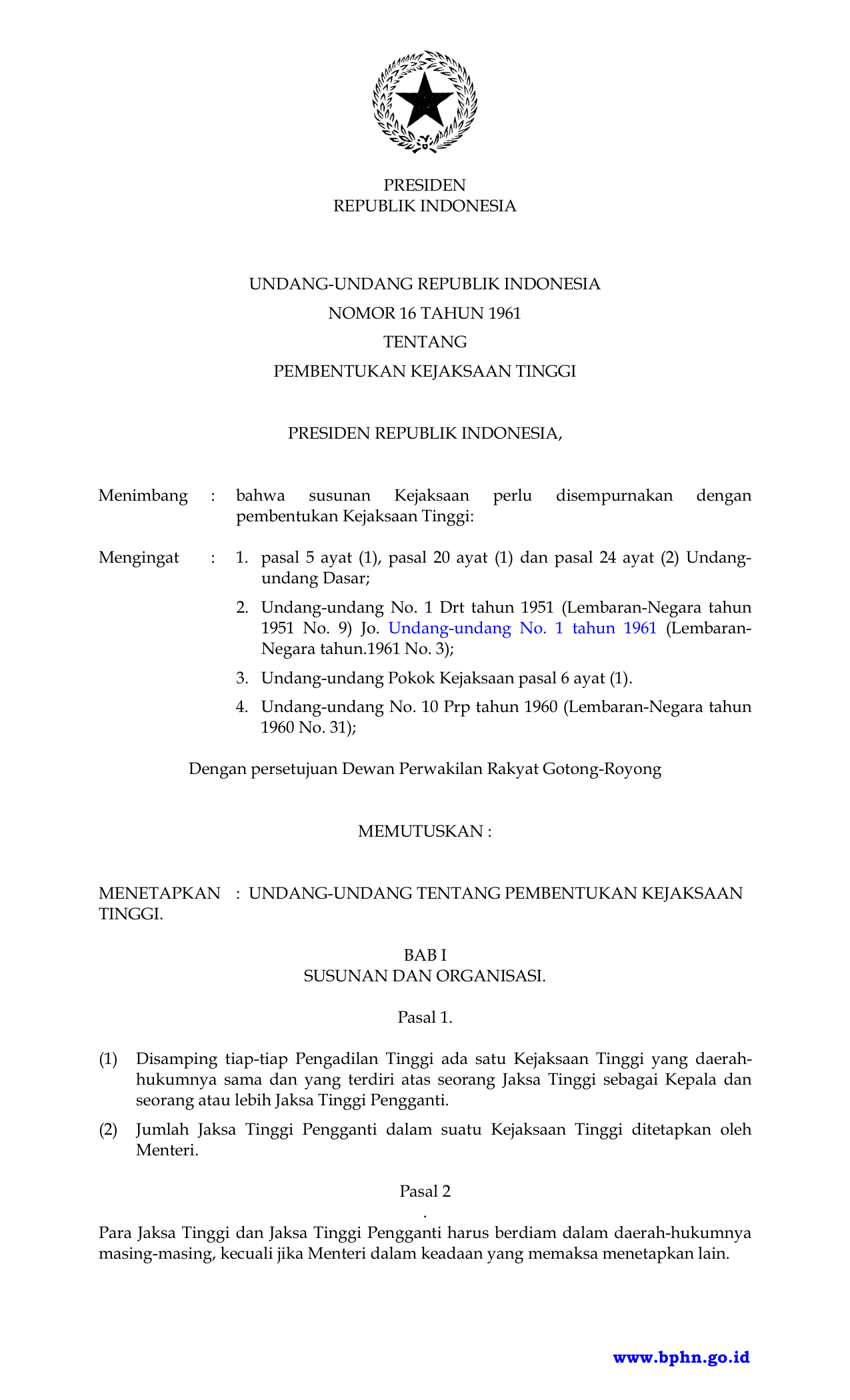 UU Nomor 16 Tahun 1961 | Undang-Undang Nomor 16 Tahun 1961 tentang PEMBENTUKAN KEJAKSAAN TINGGI