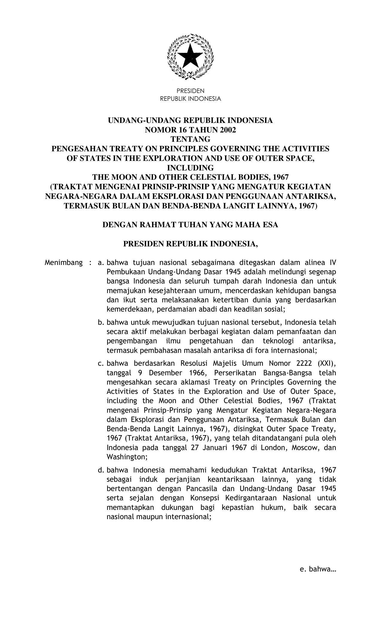UU Nomor 16 Tahun 2002 | Undang-Undang Nomor 16 Tahun 2002 tentang PENGESAHAN TREATY ON PRINCIPLES CONCERNING THE ACTIVITIES OF STATES IN THE EXPLORATION AND USE OF OUTER SPACE, INCLUDING THE MOON AND OTHER CELESTIAL BODIES, 1967 (TRAKTAT MENGENAI PRINSIP-PRINSIP YANG MENGATUR KEGIATAN NEGARA-NEGARA DALAM EKSPLORASI DAN PENGGUNAAN ANTARIKSA, TERMASUK BULAN DAN BENDA-BENDA LANGIT LAINNYA, 1967)