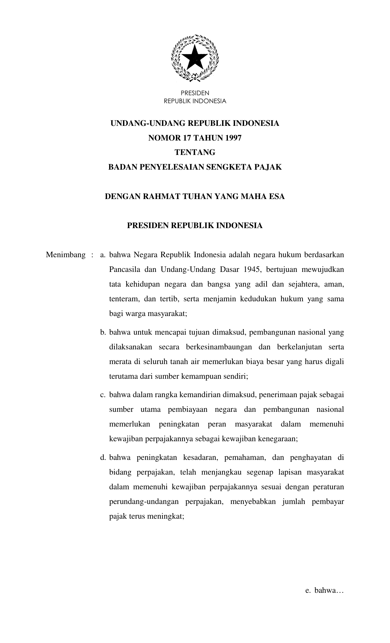 UU Nomor 17 Tahun 1997 | Undang-Undang Nomor 17 Tahun 1997 tentang BADAN PENYELESAIAN SENGKETA PAJAK