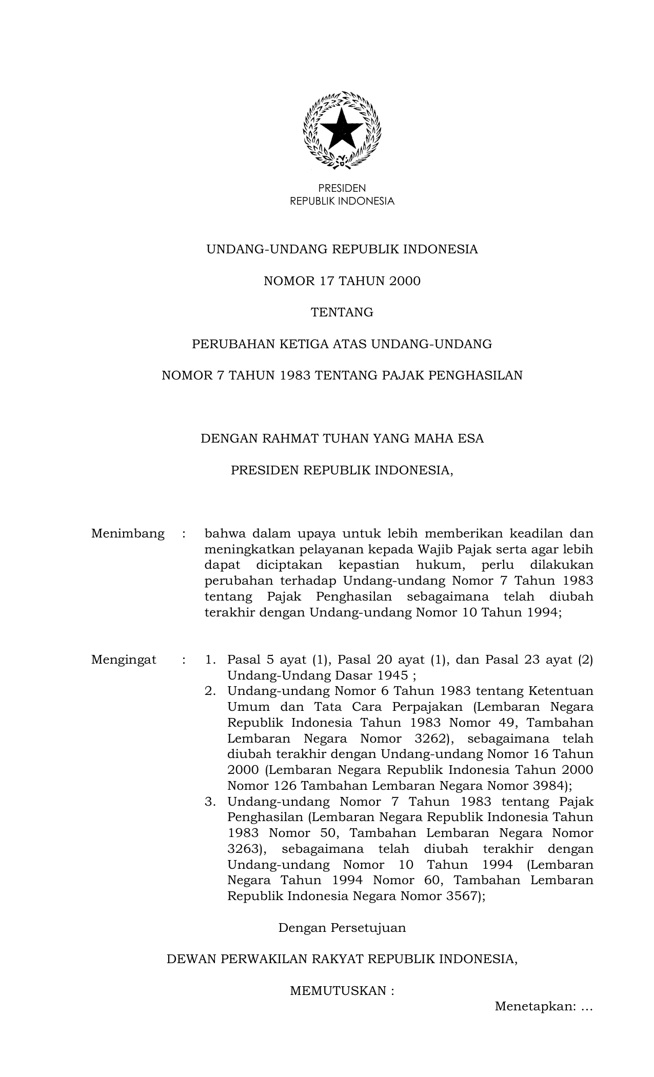 UU Nomor 17 Tahun 2000 | Undang-Undang Nomor 17 Tahun 2000 tentang PERUBAHAN KETIGA UU 7-1983 TENTANG PAJAK PENGHASILAN