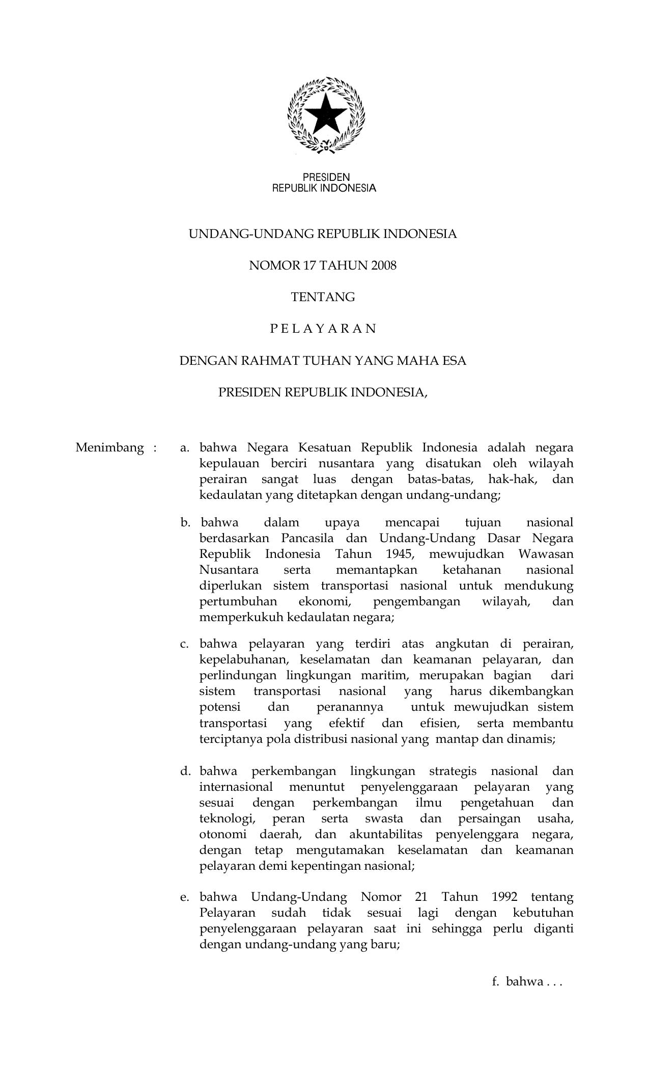 UU Nomor 17 Tahun 2008 | Undang-Undang Nomor 17 Tahun 2008 tentang PELAYARAN