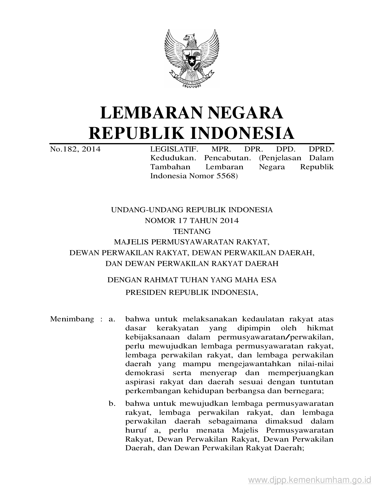 UU Nomor 17 Tahun 2014 | Undang-Undang Nomor 17 Tahun 2014 tentang MAJELIS PERMUSYAWARATAN RAKYAT, DEWAN PERWAKILAN RAKYAT, DEWAN PERWAKILAN DAERAH, DAN DEWAN PERWAKILAN RAKYAT DAERAH