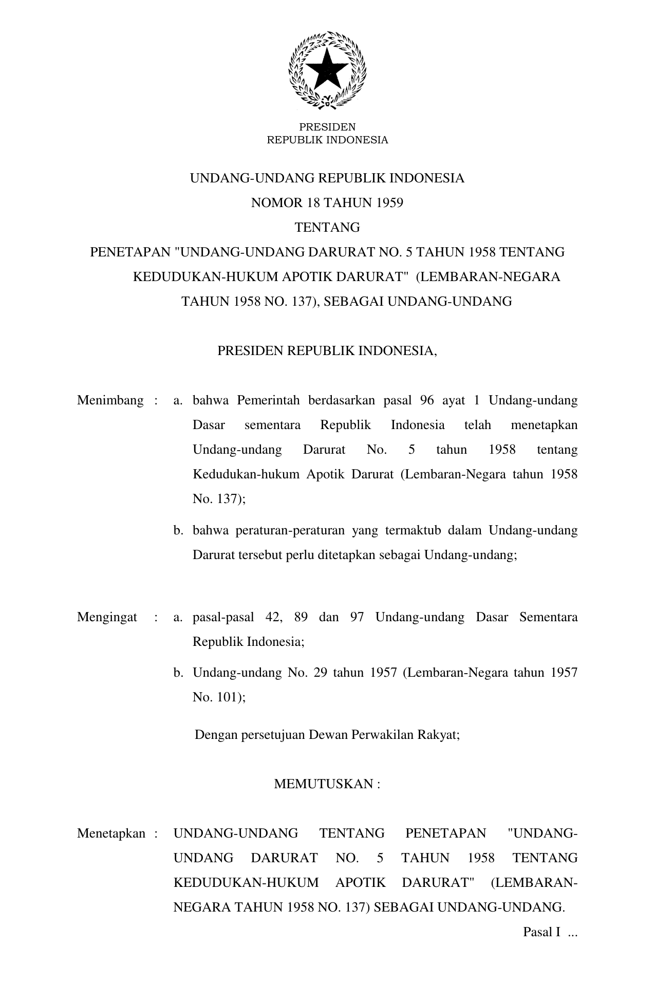 UU Nomor 18 Tahun 1959 | Undang-Undang Nomor 18 Tahun 1959 tentang PENETAPAN "UNDANG-UNDANG DARURAT NO. 5 TAHUN 1958 TENTANG KEDUDUKAN-HUKUM APOTIK DARURAT" (LEMBARAN-NEGARA TAHUN 1958 NO. 137), SEBAGAI UNDANG-UNDANG *)
