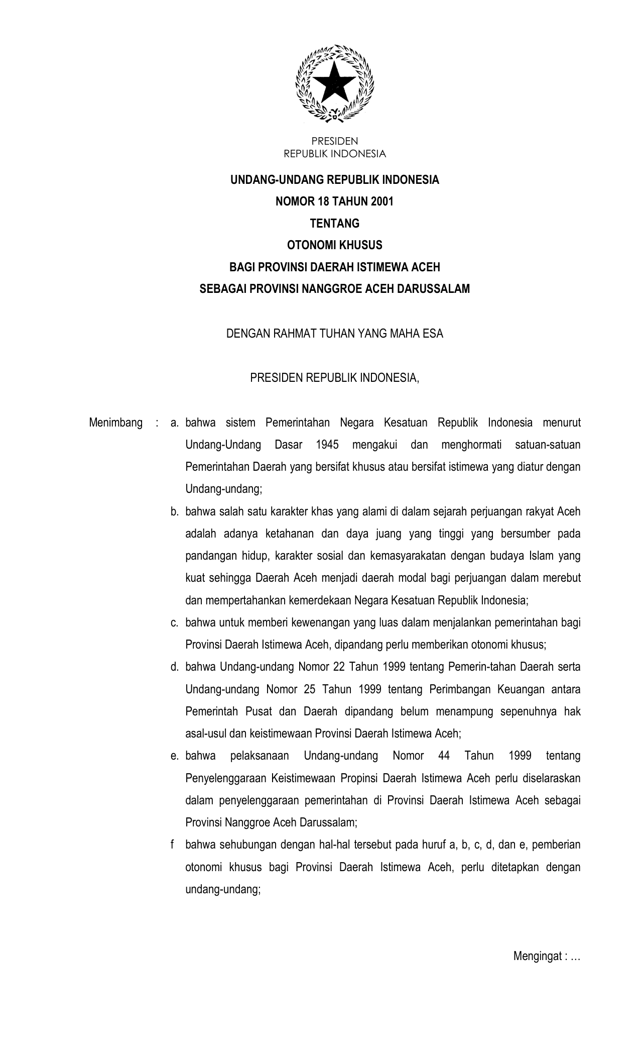 UU Nomor 18 Tahun 2001 | Undang-Undang Nomor 18 Tahun 2001 tentang OTONOMI KHUSUS BAGI PROVINSI DAERAH ISTIMEWA ACEH SEBAGAI PROVINSI NANGGROE ACEH DARUSSALAM