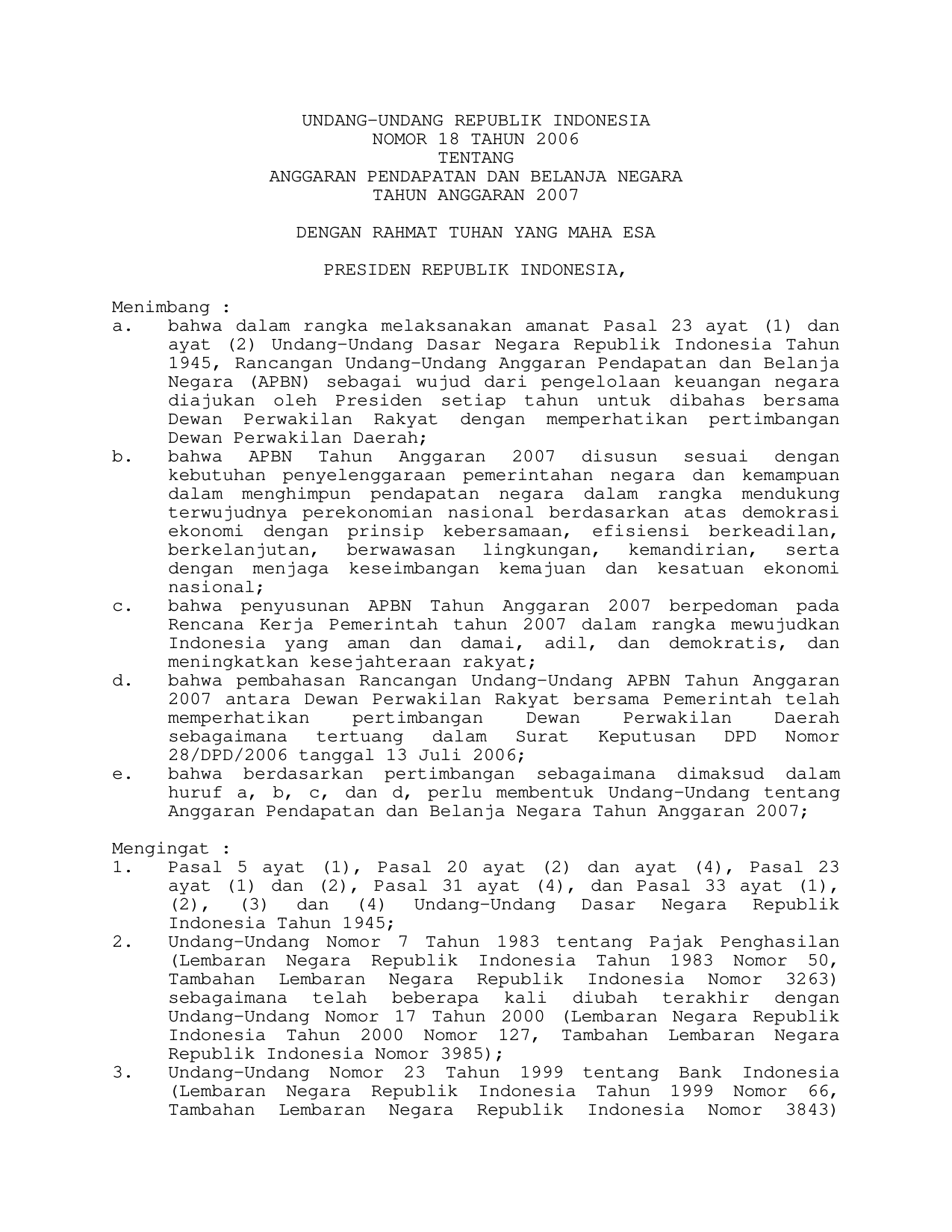 UU Nomor 18 Tahun 2006 | Undang-Undang Nomor 18 Tahun 2006 tentang ANGGARAN PENDAPATAN DAN BELANJA NEGARA TAHUN ANGGARAN 2007