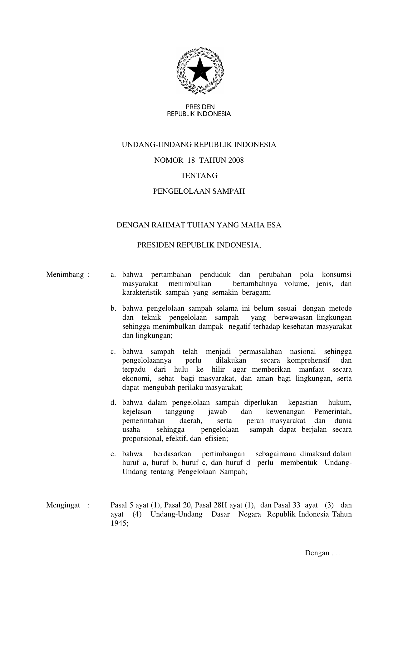 UU Nomor 18 Tahun 2008 | Undang-Undang Nomor 18 Tahun 2008 tentang PENGELOLAAN SAMPAH