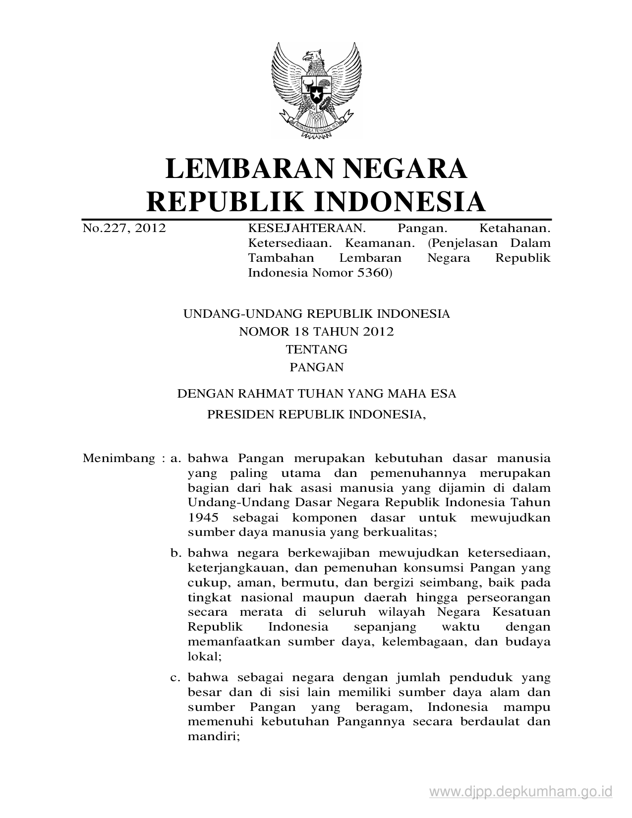 UU Nomor 18 Tahun 2012 | Undang-Undang Nomor 18 Tahun 2012 tentang PANGAN