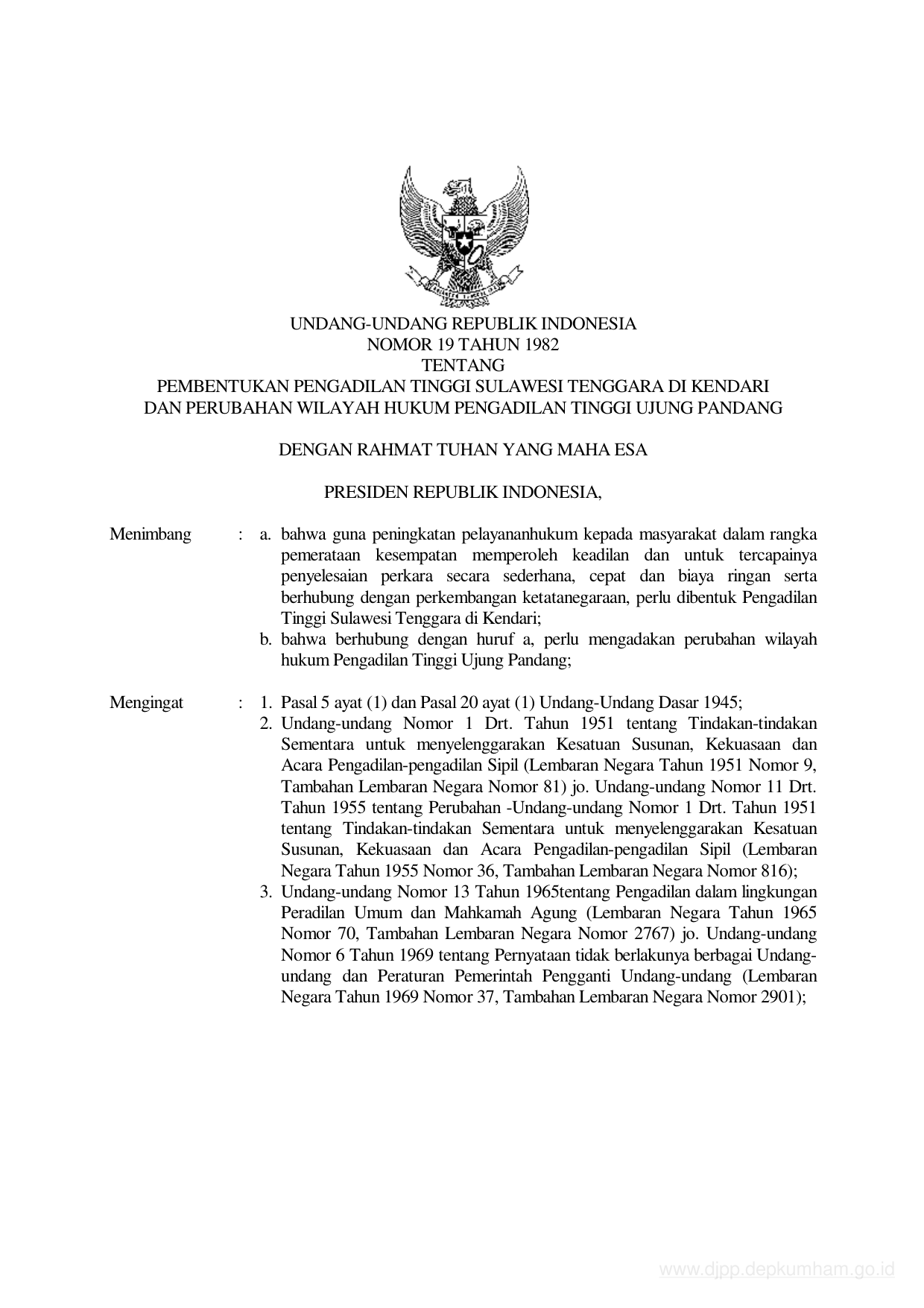 UU Nomor 19 Tahun 1982 | Undang-Undang Nomor 19 Tahun 1982 tentang PEMBENTUKAN PENGADILAN TINGGI SULAWESI TENGGARA DI KENDARI DAN PERUBAHAN WILAYAH HUKUM PENGADILAN TINGGI UJUNG PANDANG