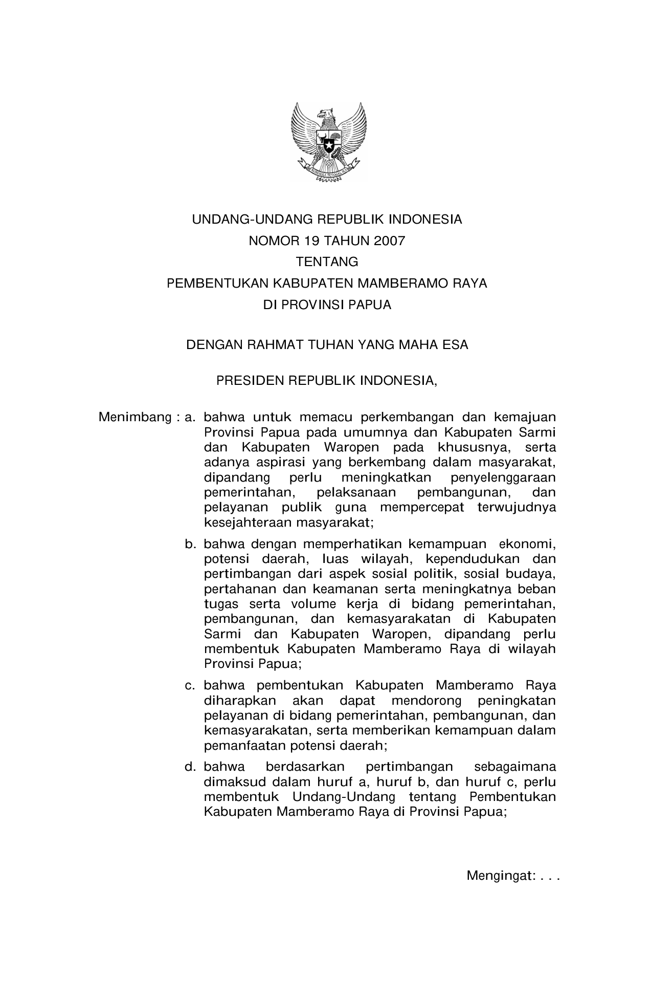 UU Nomor 19 Tahun 2007 | Undang-Undang Nomor 19 Tahun 2007 tentang PEMBENTUKAN KABUPATEN MAMBERAMO RAYA DI PROVINSI PAPUA