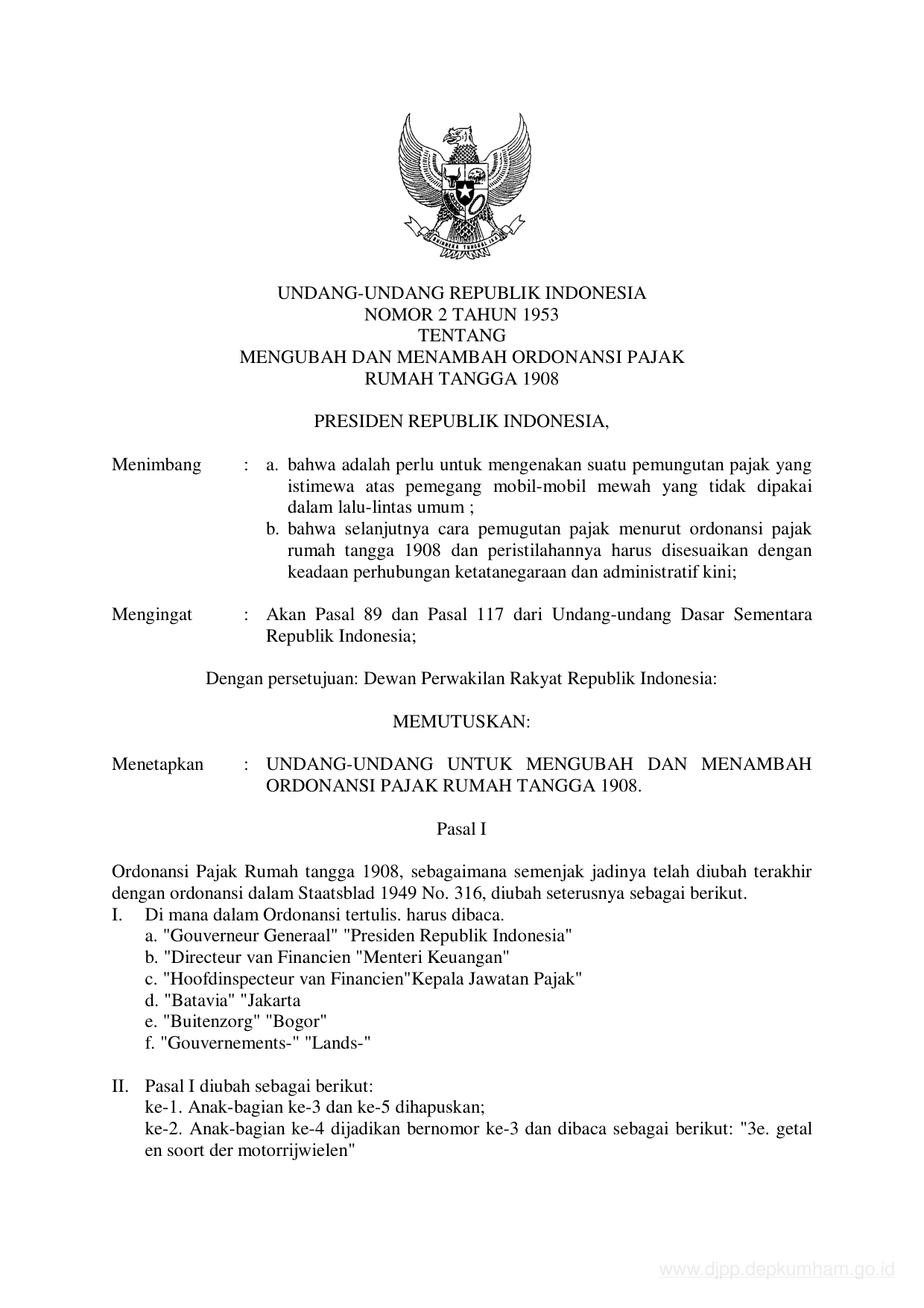 UU Nomor 2 Tahun 1953 | Undang-Undang Nomor 2 Tahun 1953 tentang MENGUBAH DAN MENAMBAH ORDONANSI PAJAK RUMAH TANGGA 1908