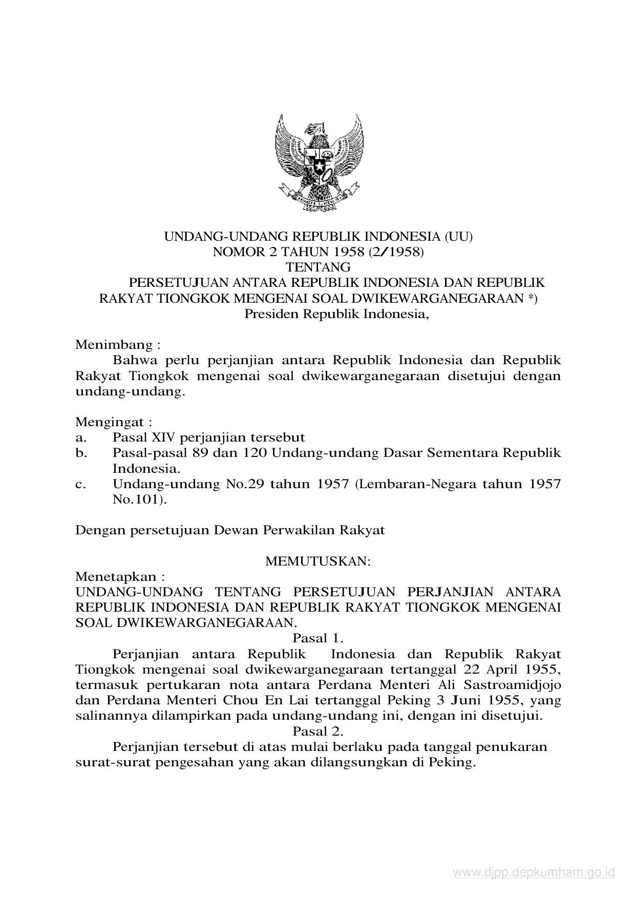 UU Nomor 2 Tahun 1958 | Undang-Undang Nomor 2 Tahun 1958 tentang PERSETUJUAN ANTARA REPUBLIK INDONESIA DAN REPUBLIK RAKYAT TIONGKOK MENGENAI SOAL DWIKEWARGANEGARAAN