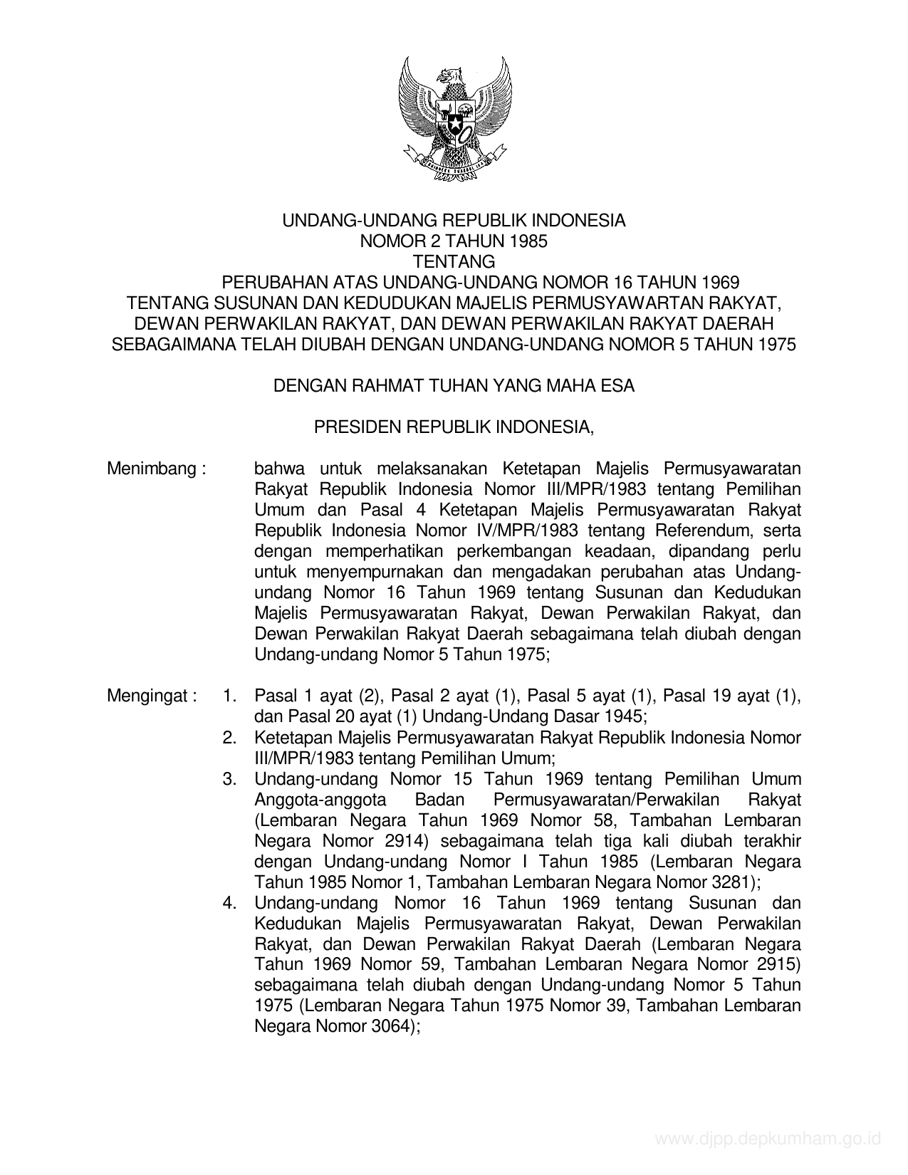 UU Nomor 2 Tahun 1985 | Undang-Undang Nomor 2 Tahun 1985 tentang PERUBAHAN UU 16-1969 TENTANG SUSUNAN DAN KEDUDUKAN MAJELIS PERMUSYAWARATAN RAKYAT, DEWAN PERWAKILAN RAKYAT, DAN DEWAN PERWAKILAN RAKYAT DAERAH SEBAGAIMANA TELAH DIUBAH DENGAN UU 5-1975