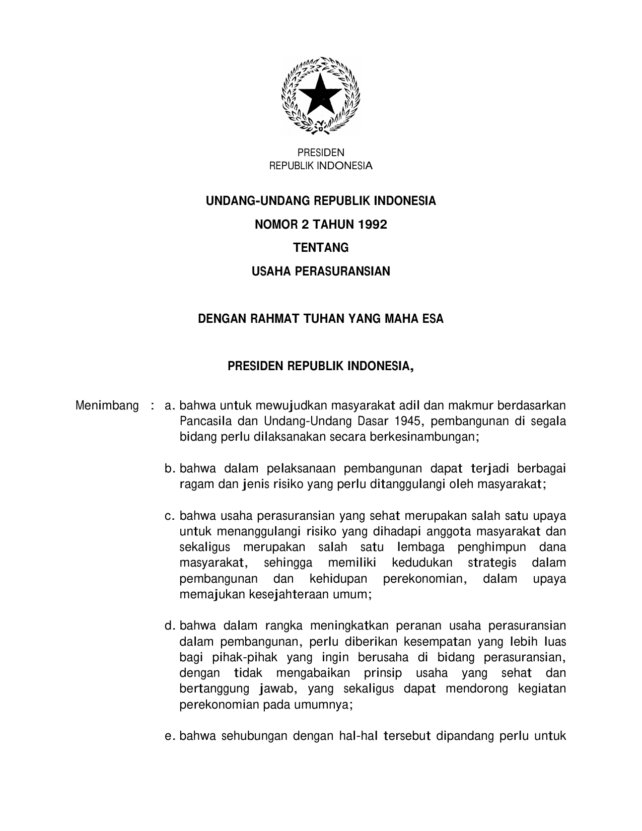 UU Nomor 2 Tahun 1992 | Undang-Undang Nomor 2 Tahun 1992 tentang USAHA PERASURANSIAN