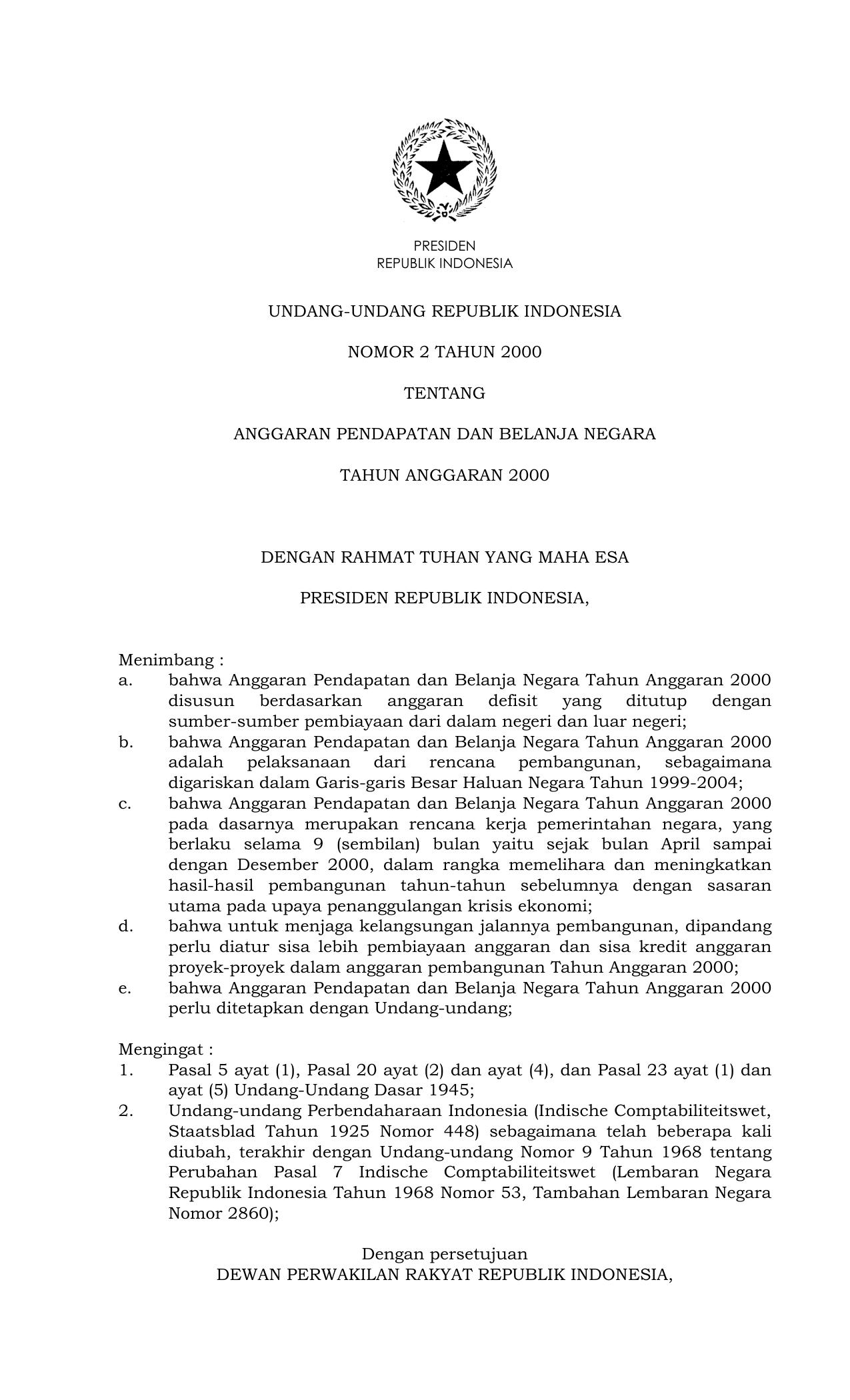 UU Nomor 2 Tahun 2000 | Undang-Undang Nomor 2 Tahun 2000 tentang ANGGARAN PENDAPATAN DAN BELANJA NEGARA TAHUN ANGGARAN 2000