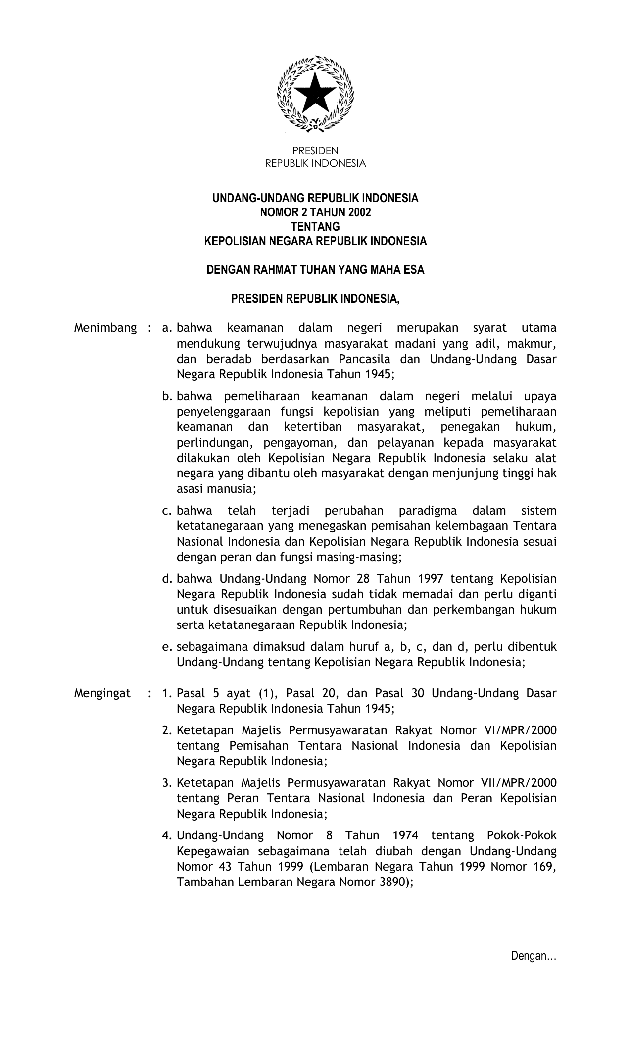UU Nomor 2 Tahun 2002 | Undang-Undang Nomor 2 Tahun 2002 tentang KEPOLISIAN NEGARA RI