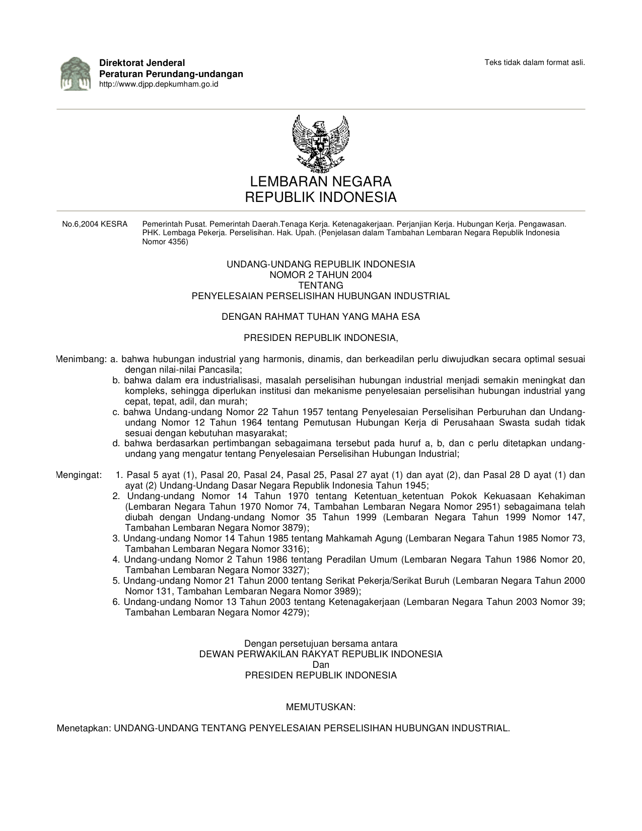 UU Nomor 2 Tahun 2004 | Undang-Undang Nomor 2 Tahun 2004 tentang PENYELESAIAN PERSELISIHAN HUBUNGAN INDUSTRIAL
