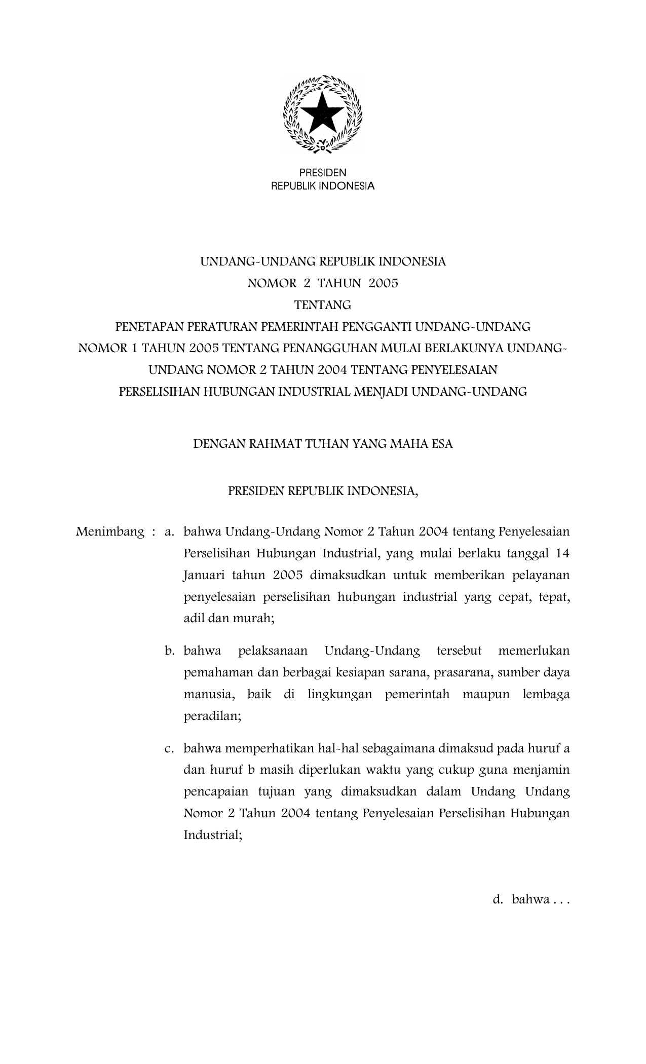 UU Nomor 2 Tahun 2005 | Undang-Undang Nomor 2 Tahun 2005 tentang PENETAPAN PERPU 1-2005 TENTANG PENANGGUHAN MULAI BERLAKUNYA UU 2-2004 TENTANG PENYELESAIAN PERSELISIHAN HUBUNGAN INDUSTRIAL MENJADI UU