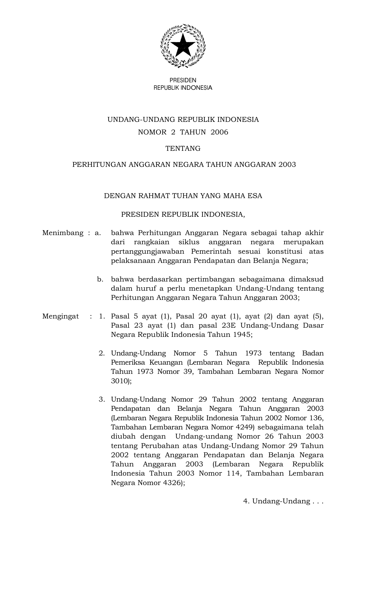 UU Nomor 2 Tahun 2006 | Undang-Undang Nomor 2 Tahun 2006 tentang PERHITUNGAN ANGGARAN NEGARA TAHUN ANGGARAN 2003