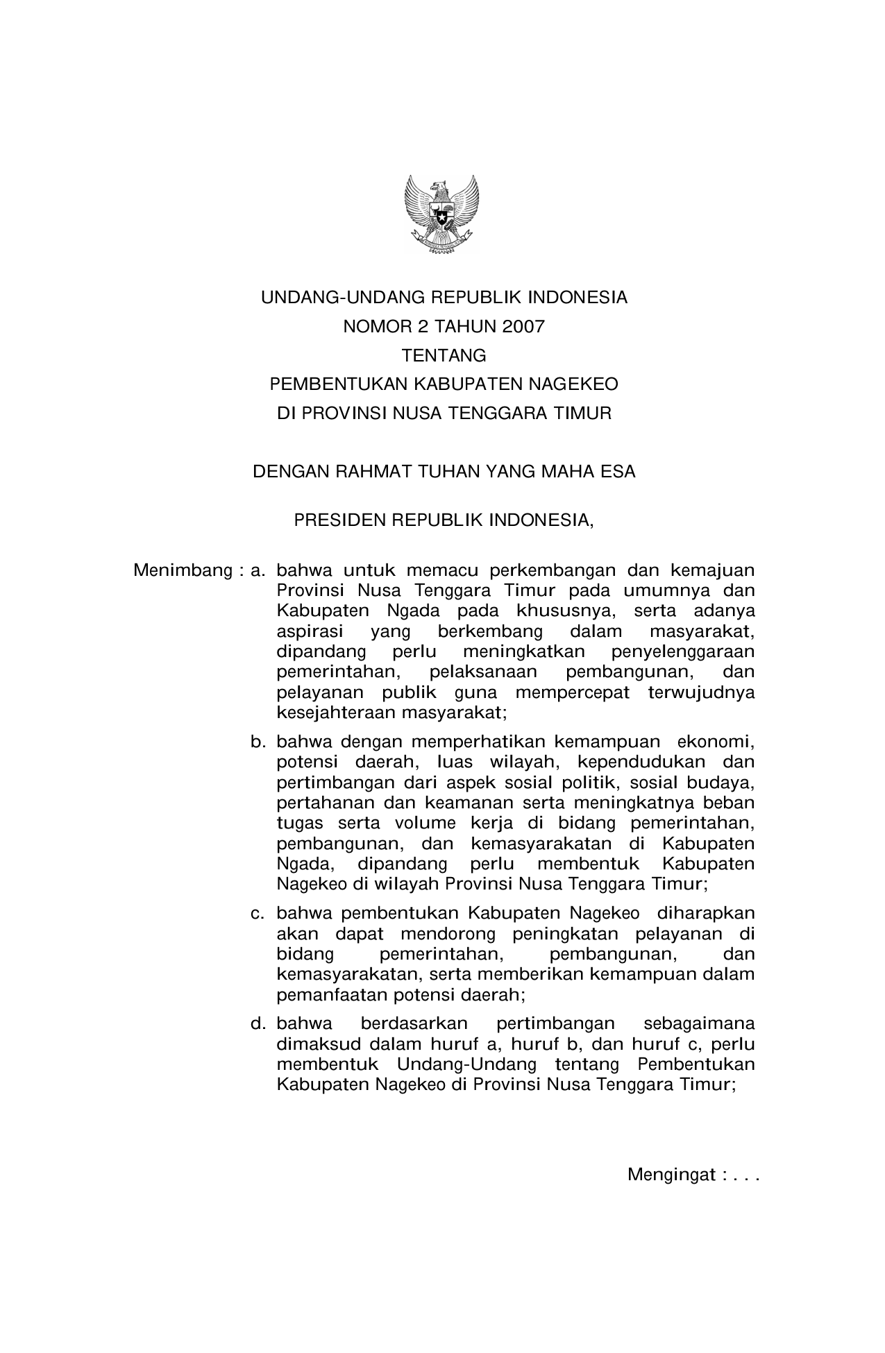 UU Nomor 2 Tahun 2007 | Undang-Undang Nomor 2 Tahun 2007 tentang PEMBENTUKAN KABUPATEN NAGEKEO DI PROVINSI NUSA TENGGARA TIMUR