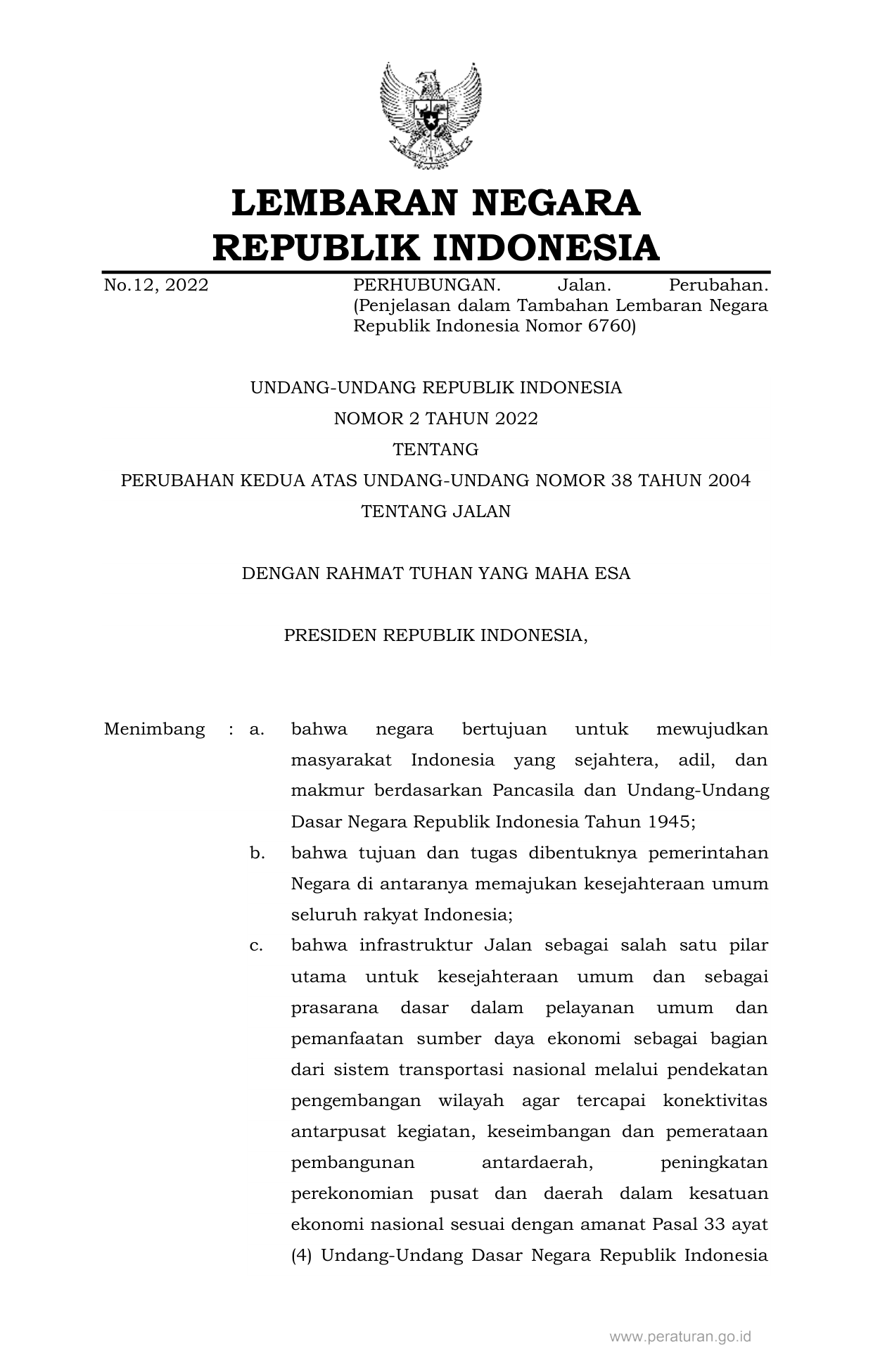 UU Nomor 2 Tahun 2022 | Undang-Undang Nomor 2 Tahun 2022 tentang PERUBAHAN KEDUA ATAS UNDANG-UNDANG NOMOR 38 TAHUN 2004 TENTANG JALAN