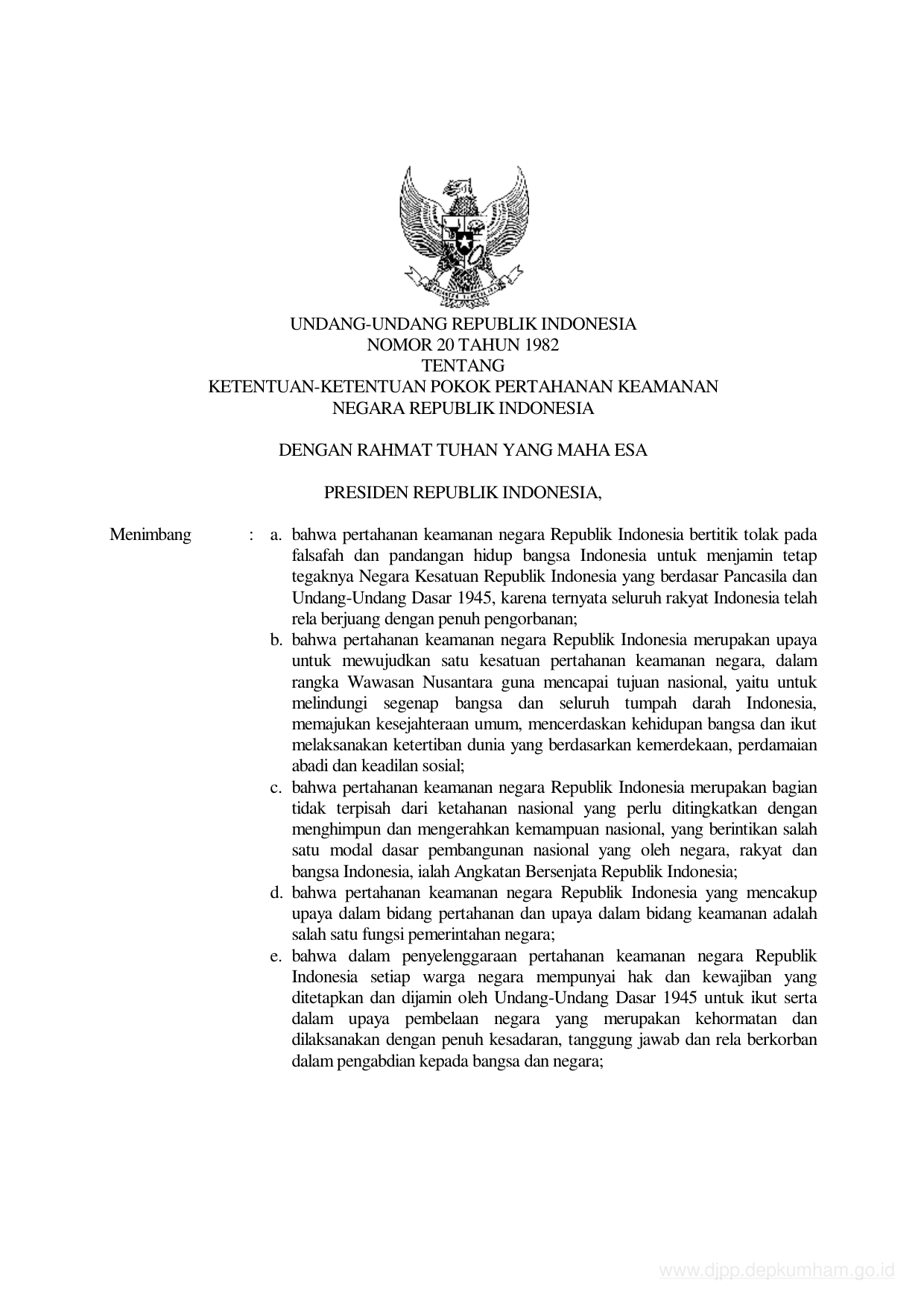 UU Nomor 20 Tahun 1982 | Undang-Undang Nomor 20 Tahun 1982 tentang KETENTUAN-KETENTUAN POKOK PERTAHANAN KEAMANAN NEGARA RI