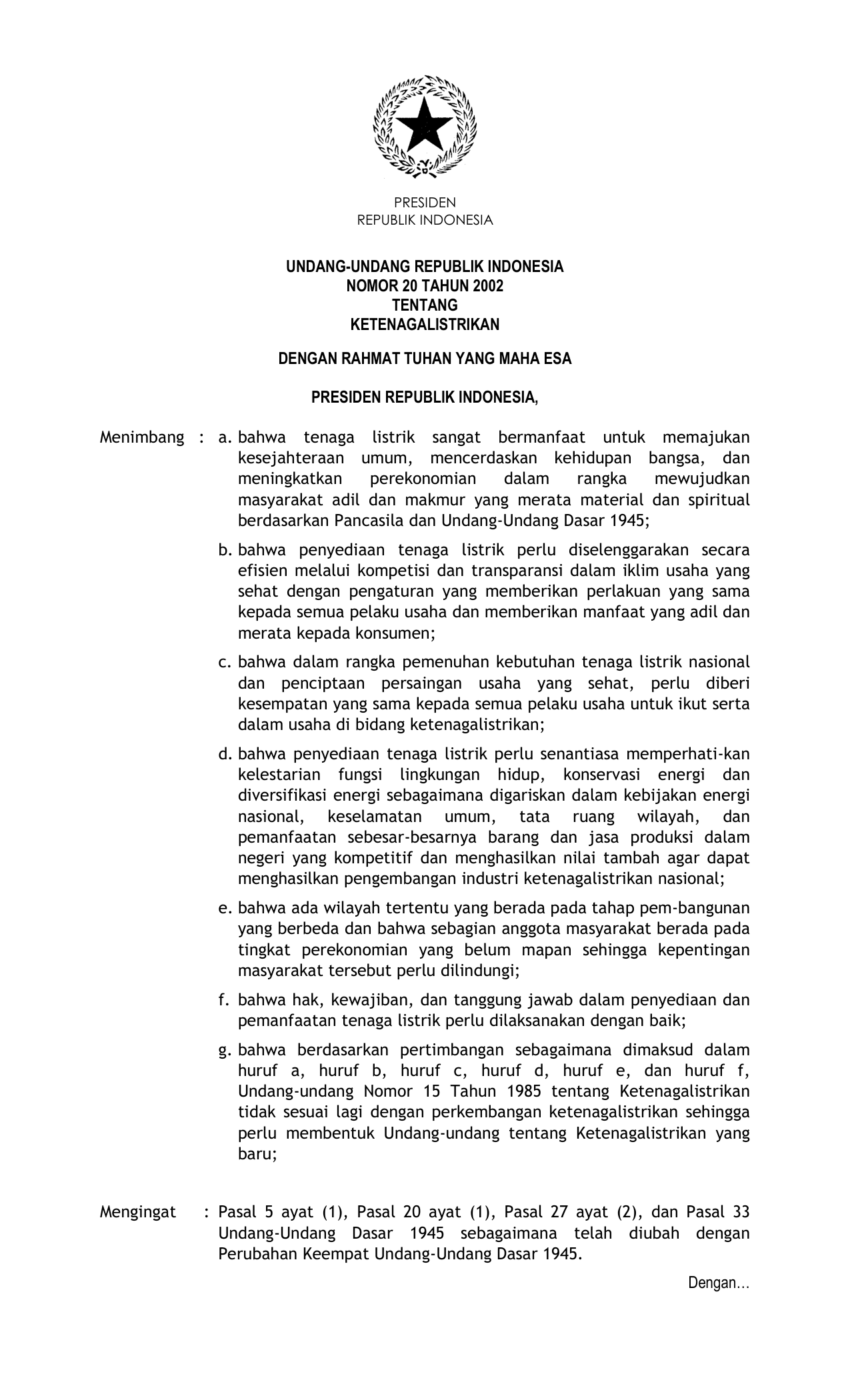 UU Nomor 20 Tahun 2002 | Undang-Undang Nomor 20 Tahun 2002 tentang KETENAGALISTRIKAN