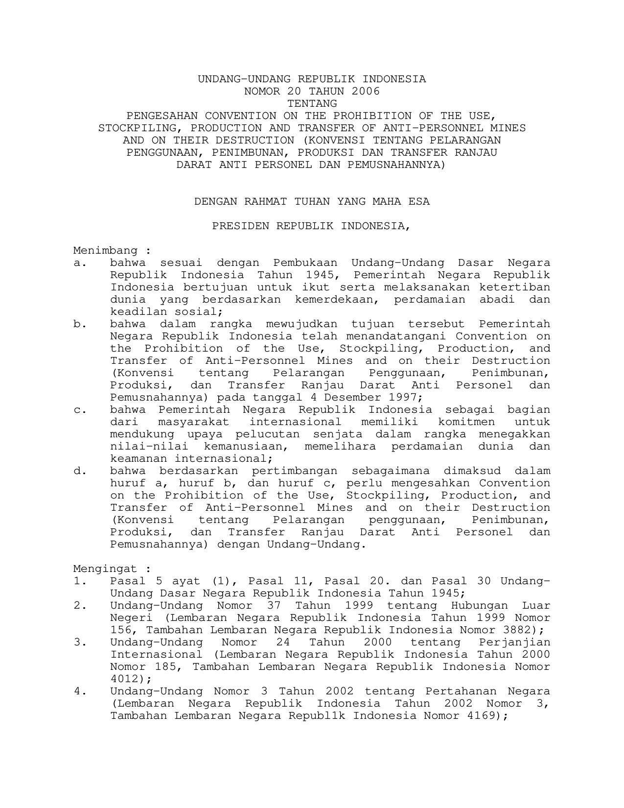 UU Nomor 20 Tahun 2006 | Undang-Undang Nomor 20 Tahun 2006 tentang PENGESAHAN CONVENTION ON THE PROHIBITION OF THE USE, STOCKPILING, PRODUCTION, AND TRANSFER OF ANTI-PERSONNEL, MINES, AND THEIR DESTRUCTION (KONVENSI PELARANGAN PENGGUNAAN, PENIMBUNAN, PRODUKSI DAN TRANSFER RANJAU DARAT ANTI PERSONAL DAN PEMUSNAHANNYA)