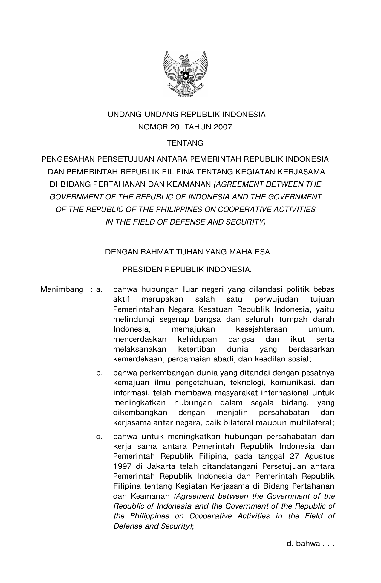 UU Nomor 20 Tahun 2007 | Undang-Undang Nomor 20 Tahun 2007 tentang PENGESAHAN PERSETUJUAN ANTARA PEMERINTAH RI DAN PEMERINTAH REPUBLIK FILIPINA TENTANG KEGIATAN KERJASAMA DI BIDANG PERTAHANAN DAN KEAMANAN