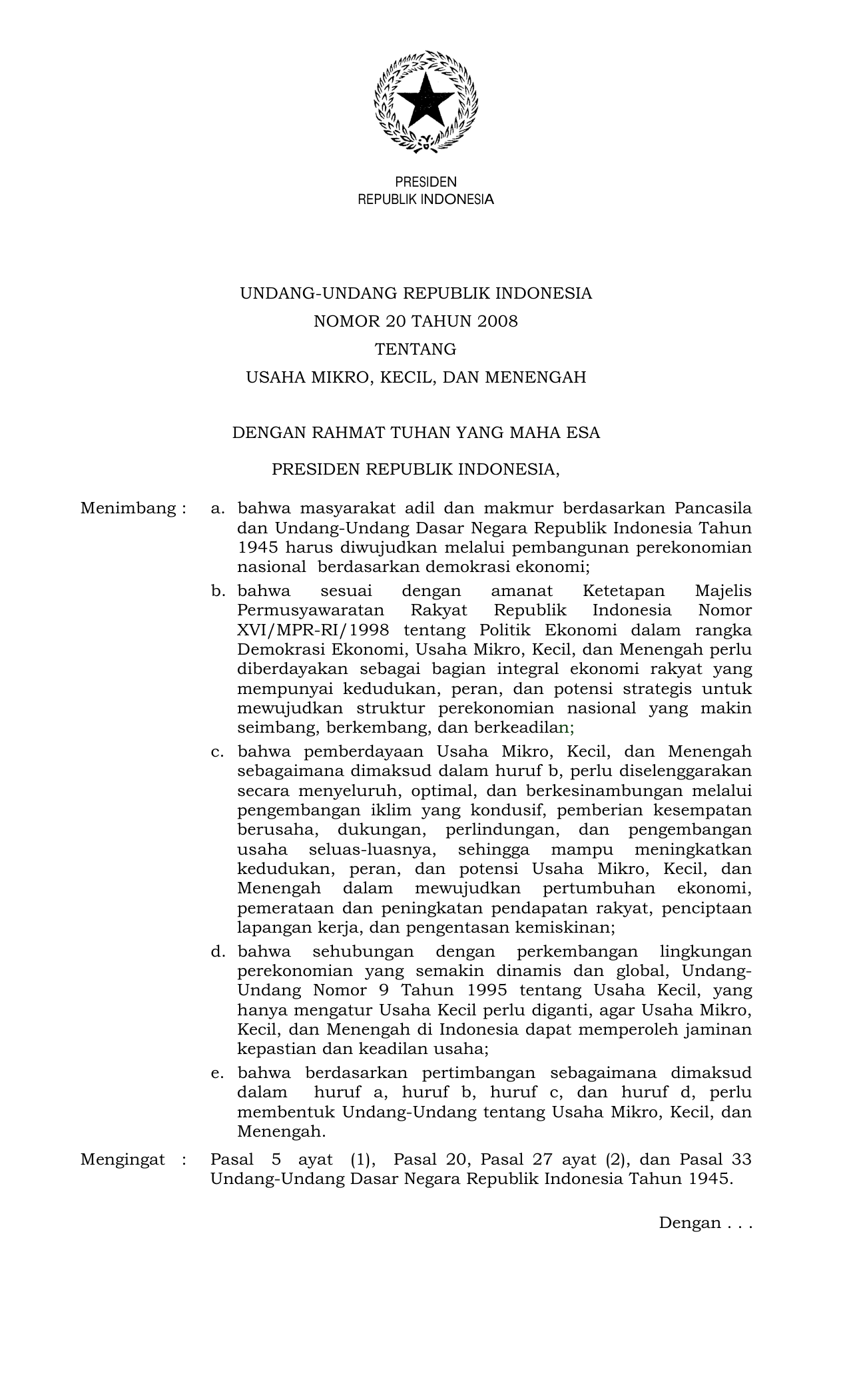 UU Nomor 20 Tahun 2008 | Undang-Undang Nomor 20 Tahun 2008 tentang USAHA MIKRO, KECIL, DAN MENENGAH