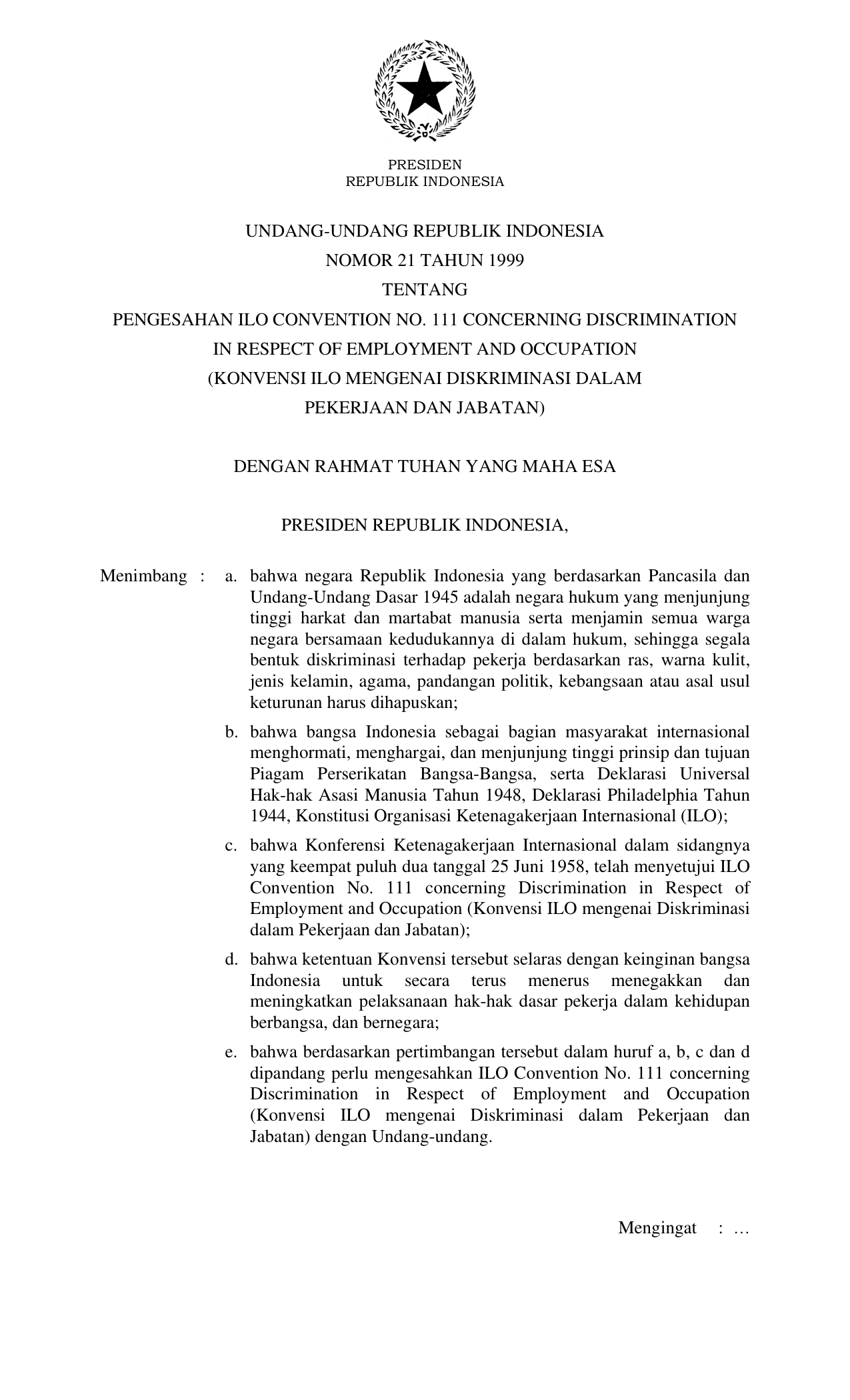 UU Nomor 21 Tahun 1999 | Undang-Undang Nomor 21 Tahun 1999 tentang PENGESAHAN ILO CONVENTION NUMBER 111 CONCERNING DISCRIMINATION IN RESPECT OF EMPLOYMENT AAND OCCUPATION (KONVENSI ILO MENGENAI DISKRIMINASI DALAM PEKERJAAN DAN JABATAN)