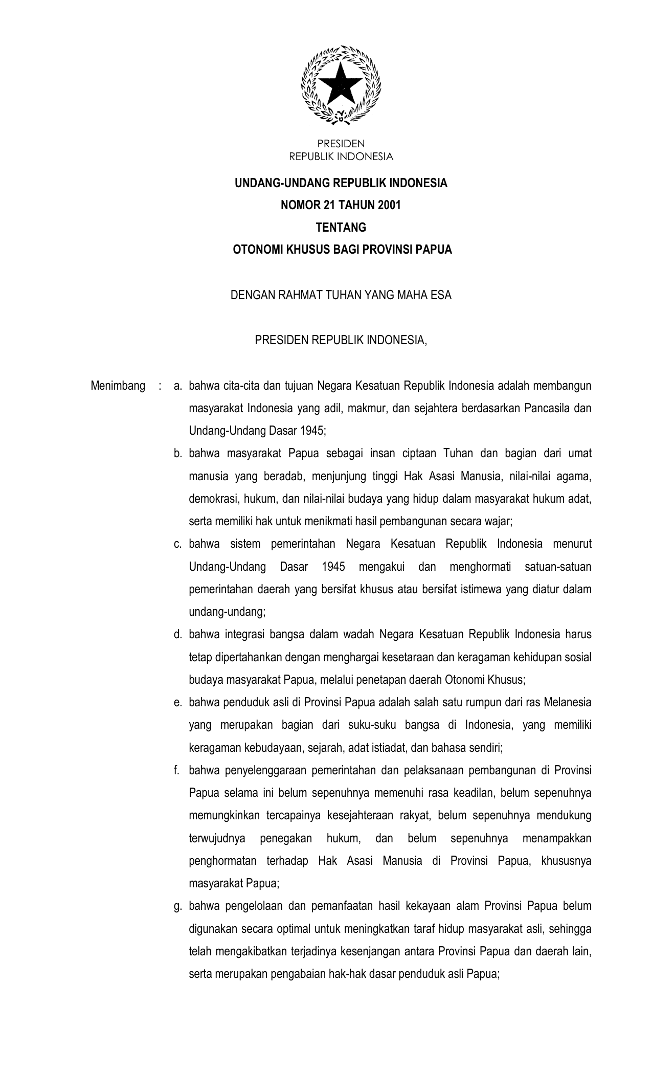 UU Nomor 21 Tahun 2001 | Undang-Undang Nomor 21 Tahun 2001 tentang OTONOMI KHUSUS BAGI PROVINSI PAPUA