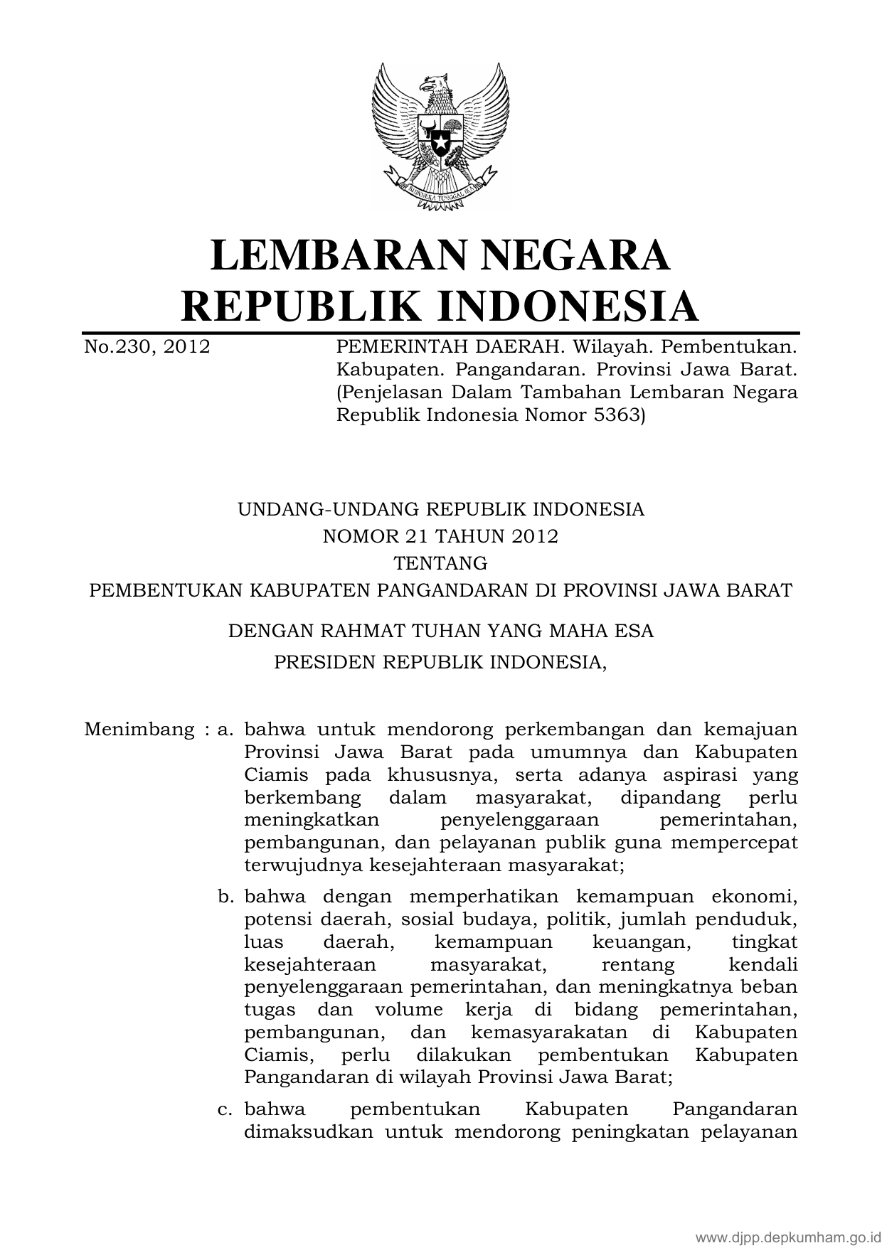 UU Nomor 21 Tahun 2012 | Undang-Undang Nomor 21 Tahun 2012 tentang PEMBENTUKAN KABUPATEN PANGANDARAN DI PROVINSI JAWA BARAT