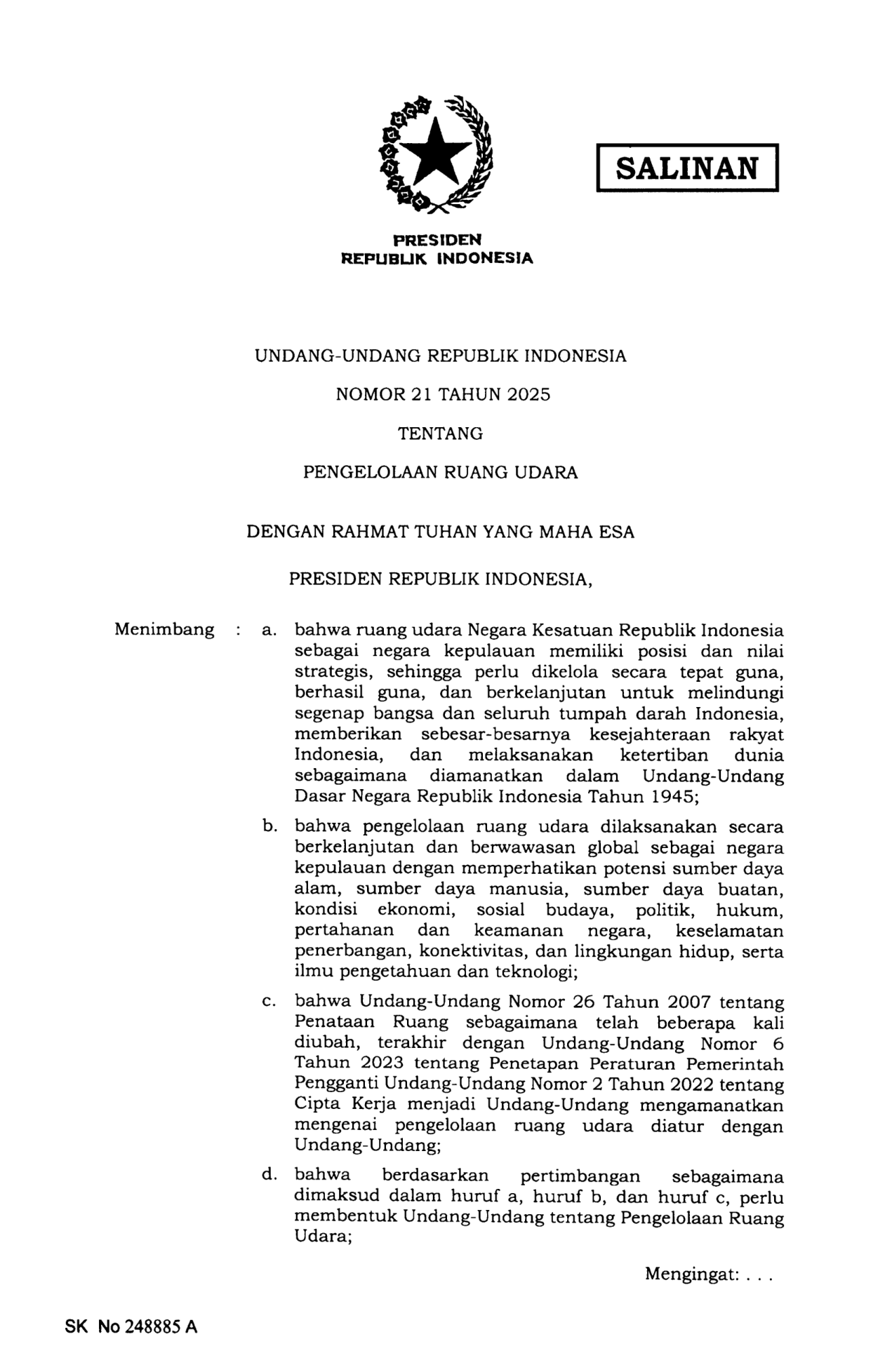 UU Nomor 21 Tahun 2025 | Undang-Undang Nomor 21 Tahun 2025 tentang Pengelolaan Ruang Udara