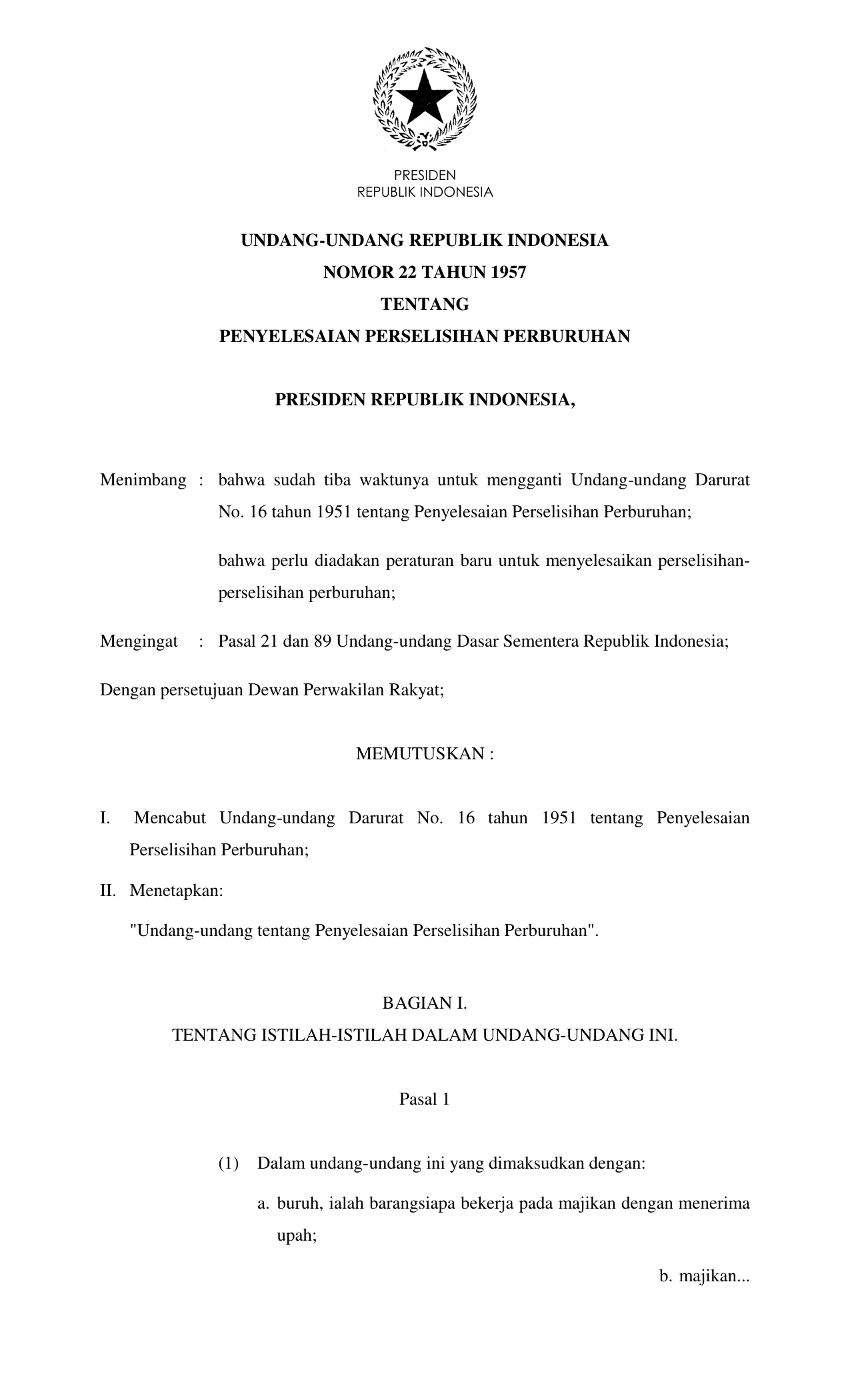 UU Nomor 22 Tahun 1957 | Undang-Undang Nomor 22 Tahun 1957 tentang PENYELESAIAN PERSELISIHAN PERBURUHAN