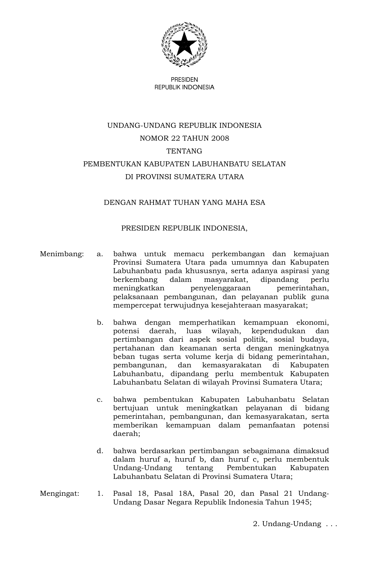 UU Nomor 22 Tahun 2008 | Undang-Undang Nomor 22 Tahun 2008 tentang PEMBENTUKAN KABUPATEN LABUHANBATU SELATAN DI PROVINSI SUMATERA UTARA