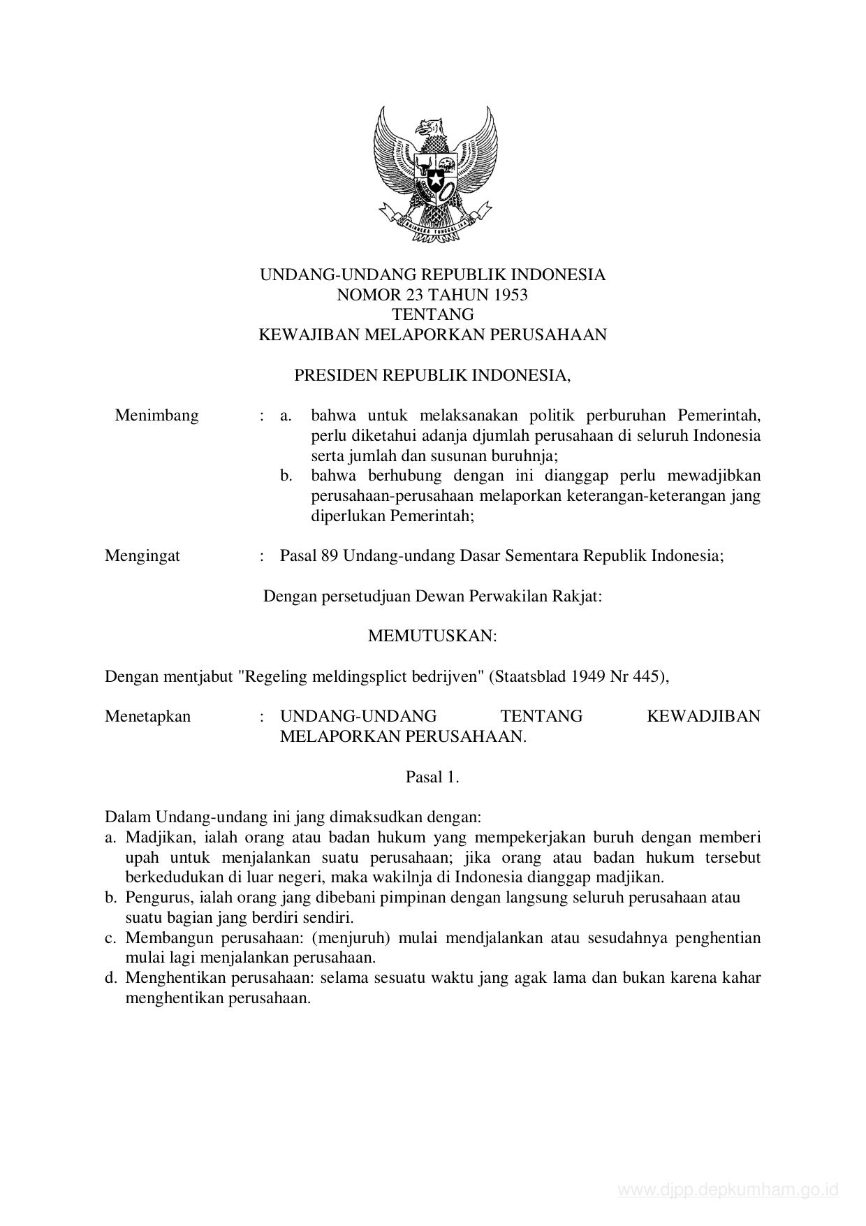 UU Nomor 23 Tahun 1953 | Undang-Undang Nomor 23 Tahun 1953 tentang KEWAJIBAN MELAPORKAN PERUSAHAAN