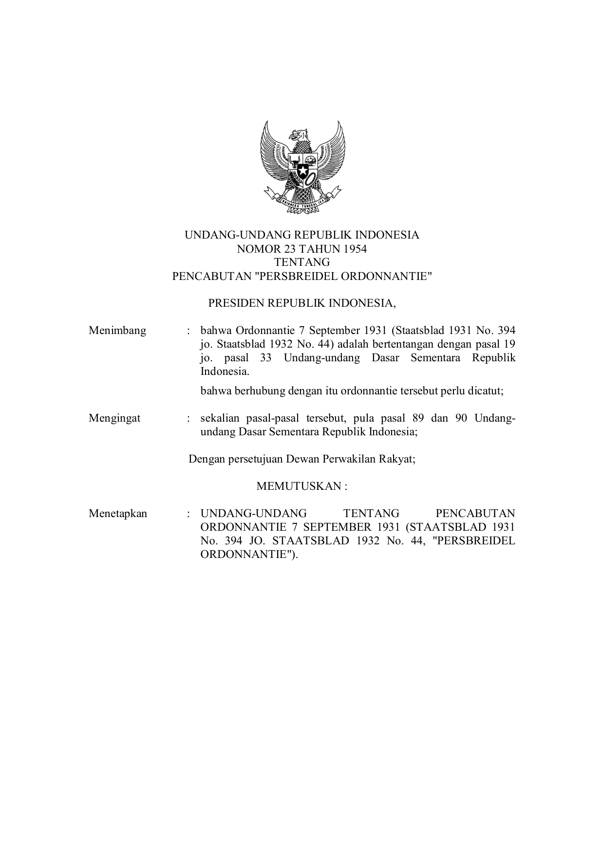 UU Nomor 23 Tahun 1954 | Undang-Undang Nomor 23 Tahun 1954 tentang PENCABUTAN �PERSBREIDEL ORDONNANTIE�