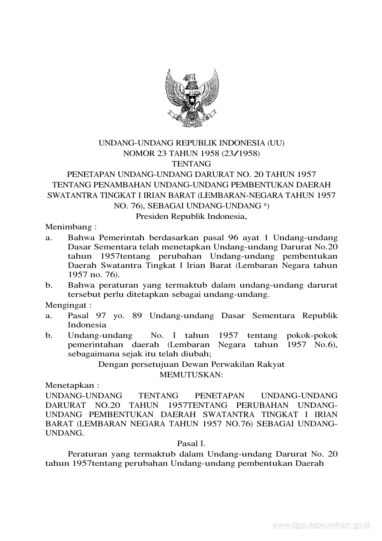 UU Nomor 23 Tahun 1958 | Undang-Undang Nomor 23 Tahun 1958 tentang PENETAPAN UNDANG-UNDANG DARURAT NO. 20 TAHUN 1957 TENTANG PENAMBAHAN UNDANG-UNDANG PEMBENTUKAN DAERAH SWATANTRA TINGKAT I IRIAN BARAT (LEMBARAN-NEGARA TAHUN 1957 NO. 76), SEBAGAI UNDANG-UNDANG