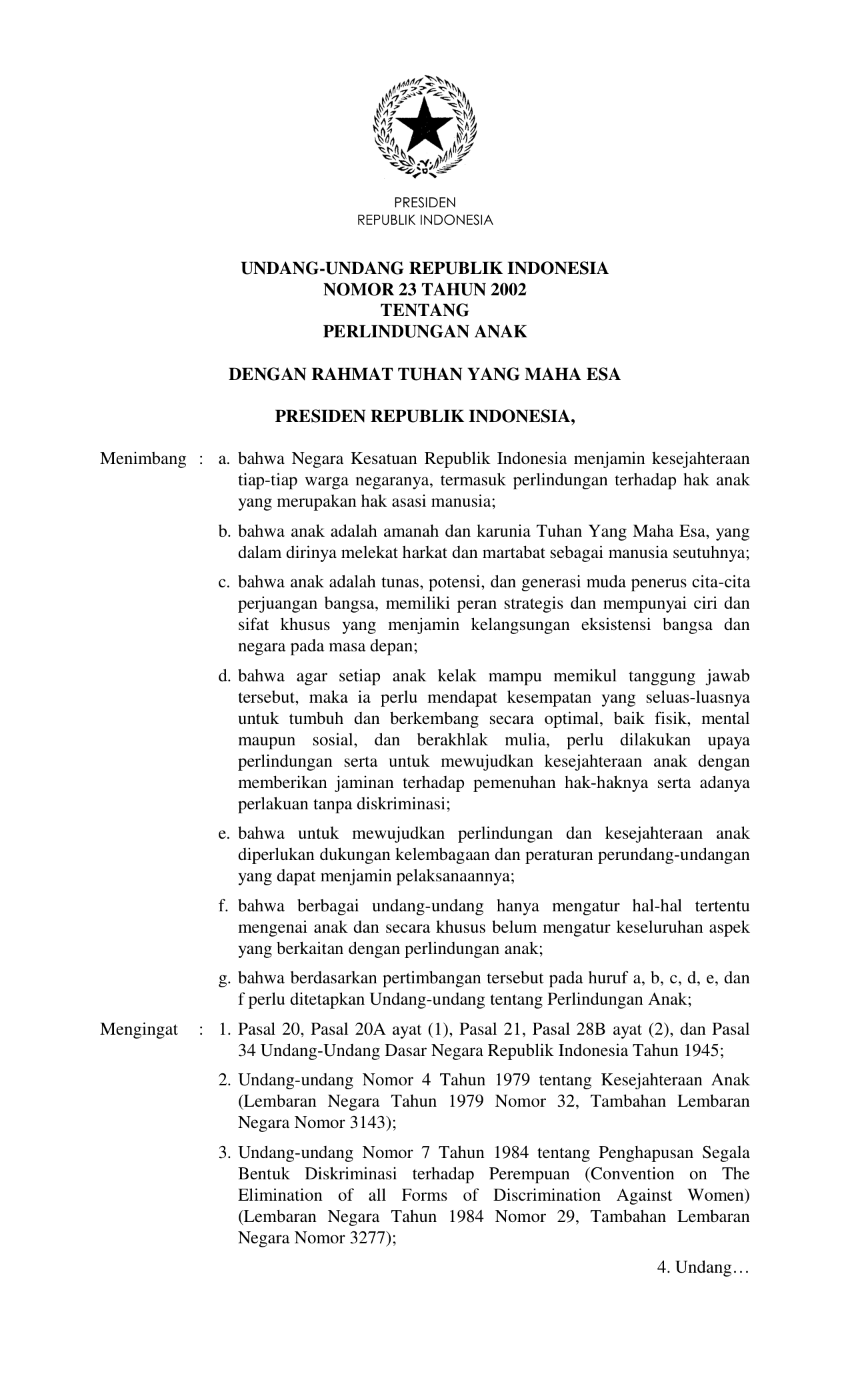 UU Nomor 23 Tahun 2002 | Undang-Undang Nomor 23 Tahun 2002 tentang PERLINDUNGAN ANAK
