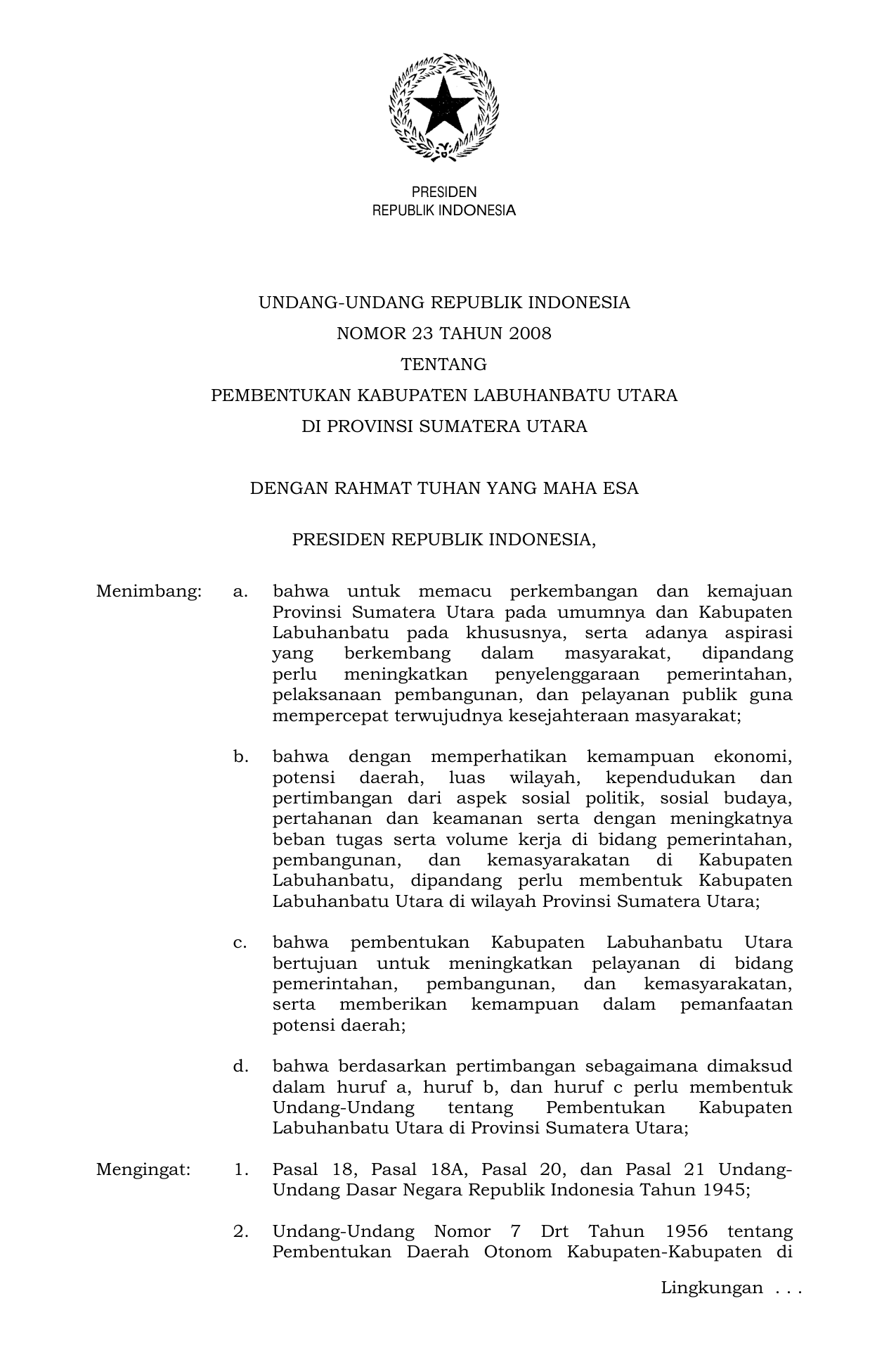 UU Nomor 23 Tahun 2008 | Undang-Undang Nomor 23 Tahun 2008 tentang PEMBENTUKAN KABUPATEN LABUHANBATU UTARA DI PROVINSI SUMATERA UTARA