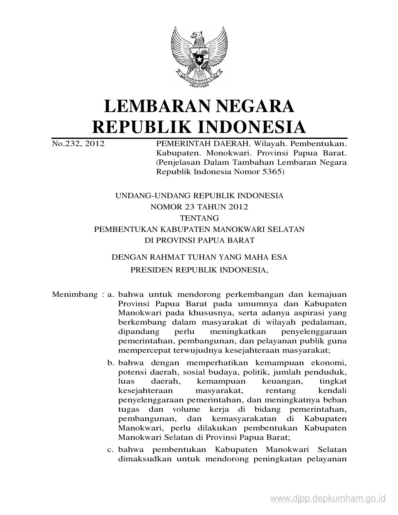 UU Nomor 23 Tahun 2012 | Undang-Undang Nomor 23 Tahun 2012 tentang PEMBENTUKAN KABUPATEN MANOKWARI SELATAN DI PROVINSI PAPUA BARAT