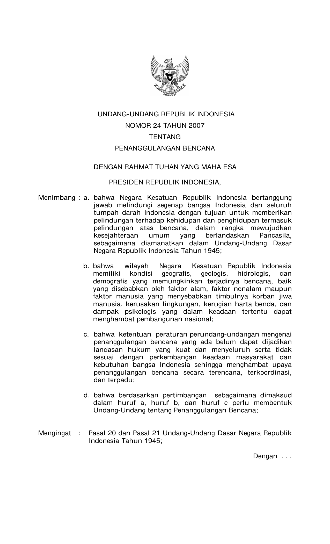 UU Nomor 24 Tahun 2007 | Undang-Undang Nomor 24 Tahun 2007 tentang PENANGGULANGAN BENCANA