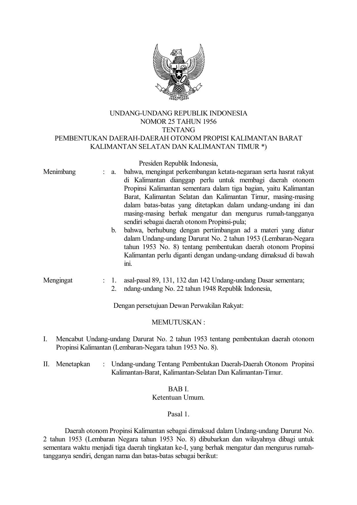 UU Nomor 25 Tahun 1956 | Undang-Undang Nomor 25 Tahun 1956 tentang PEMBENTUKAN DAERAH-DAERAH OTONOM PROPISI KALIMANTAN BARAT KALIMANTAN SELATAN DAN KALIMANTAN TIMUR