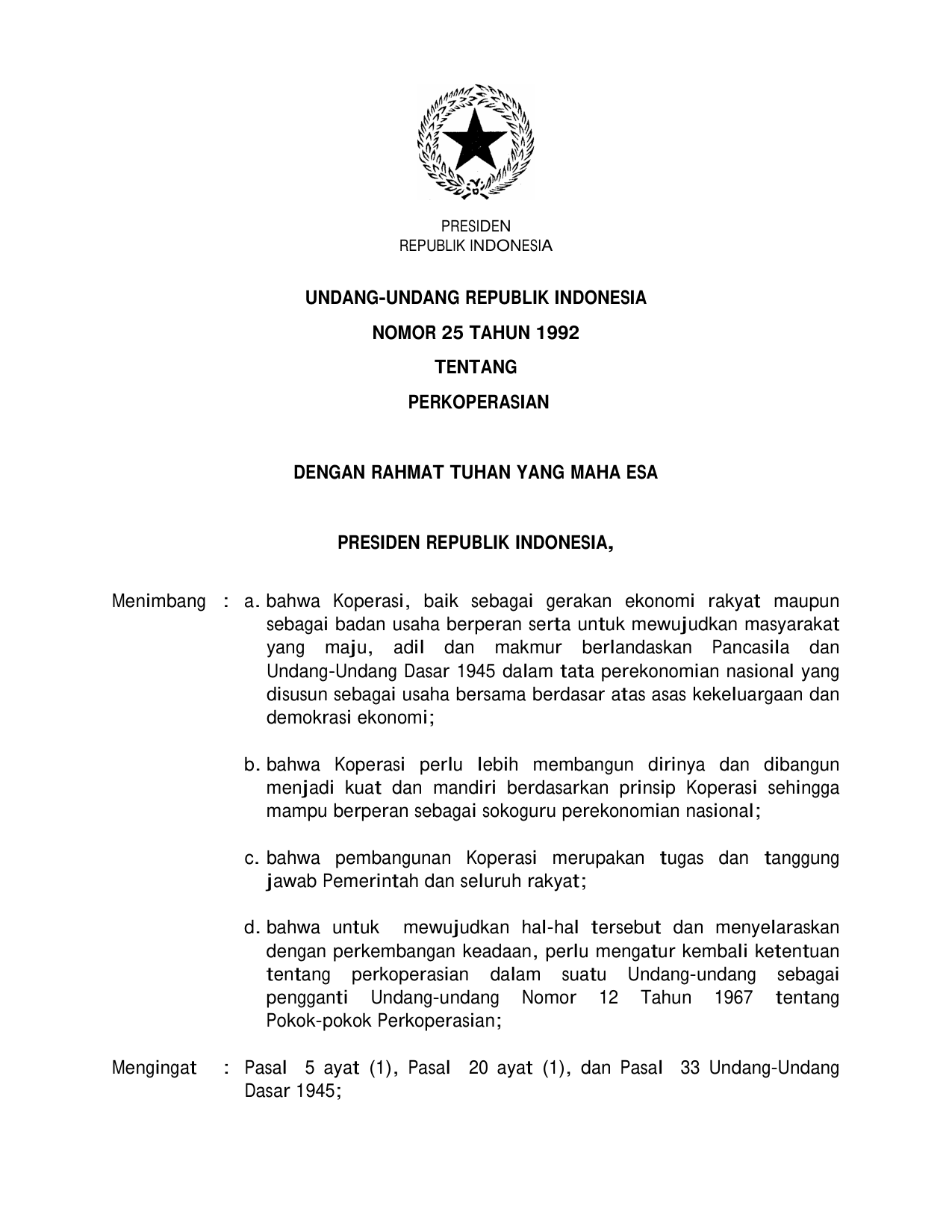 UU Nomor 25 Tahun 1992 | Undang-Undang Nomor 25 Tahun 1992 tentang PERKOPERASIAN