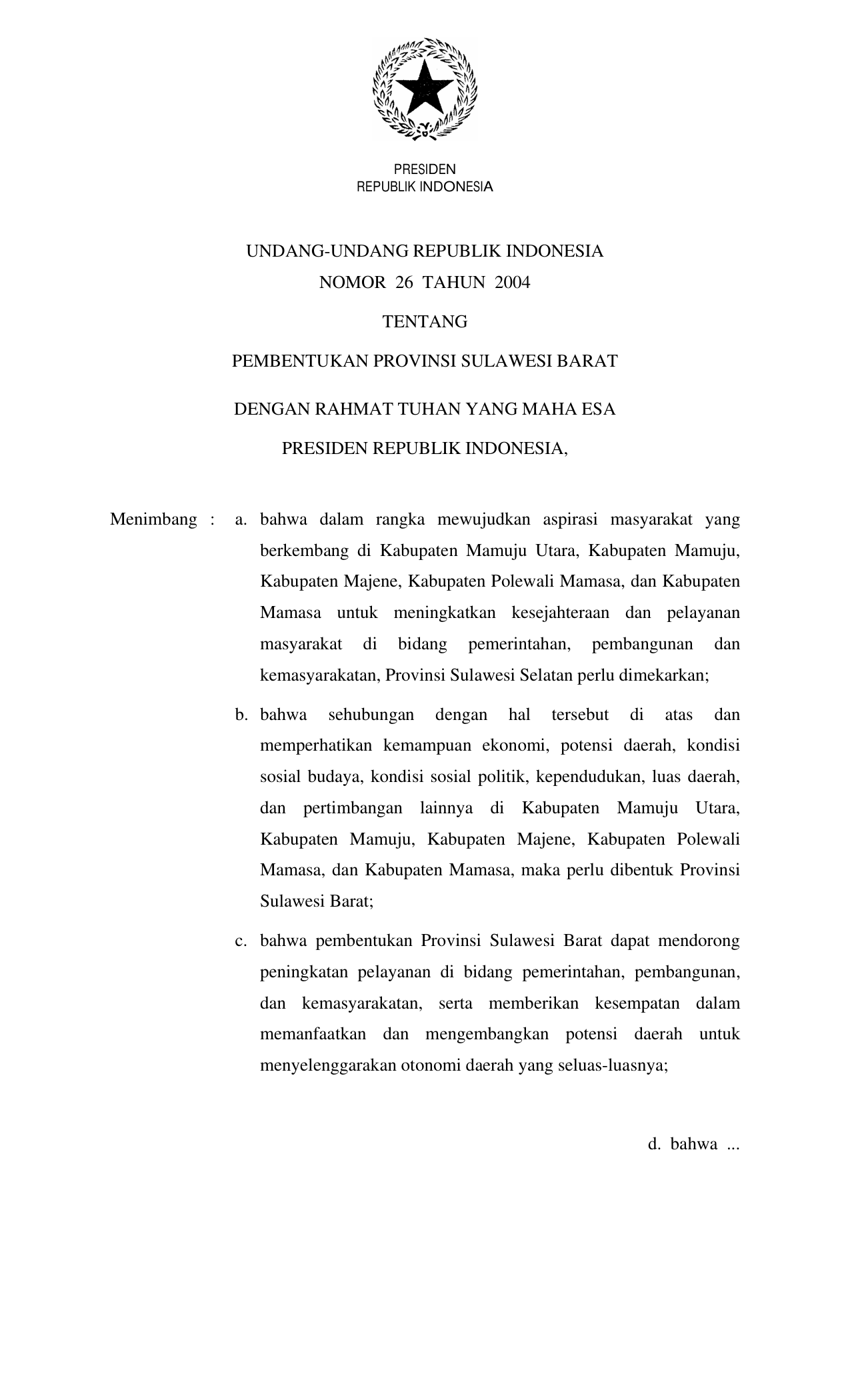 UU Nomor 26 Tahun 2004 | Undang-Undang Nomor 26 Tahun 2004 tentang PEMBENTUKAN PROVINSI SULAWESI BARAT